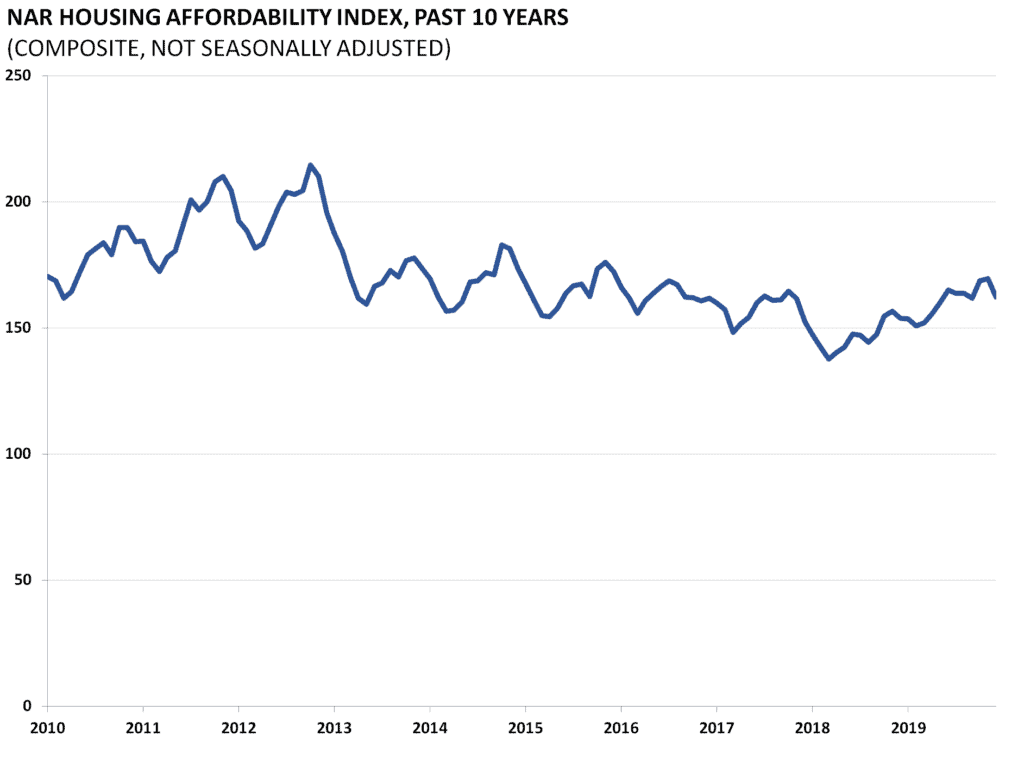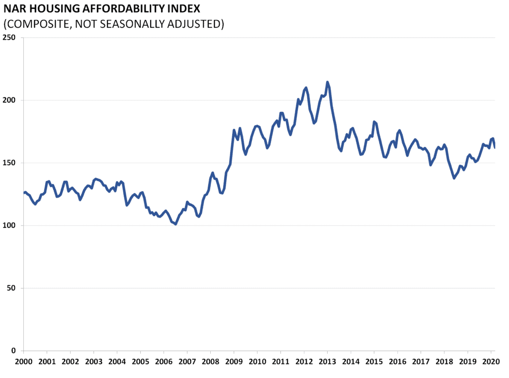 The National Association of Realtors releases updated numbers on housing affordability monthly. The measure is an index in which the value of 100 means a family has exactly enough income to quality for a mortgage on a median-priced home. Measures above 100 mean that a family has more than enough income to qualify. Since the housing bubble, home affordability has been high, a positive sign for a recovery in demand.