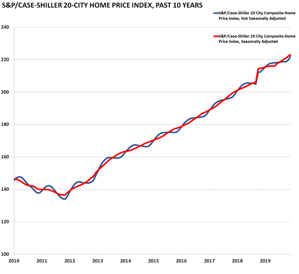 The S&P/Case-Shiller home price index is released near the end of each month for the month two months previously. The release is an index of home prices in 20 of the largest metropolitan areas across the country. It is a reputable and widely reported indicator of home prices.