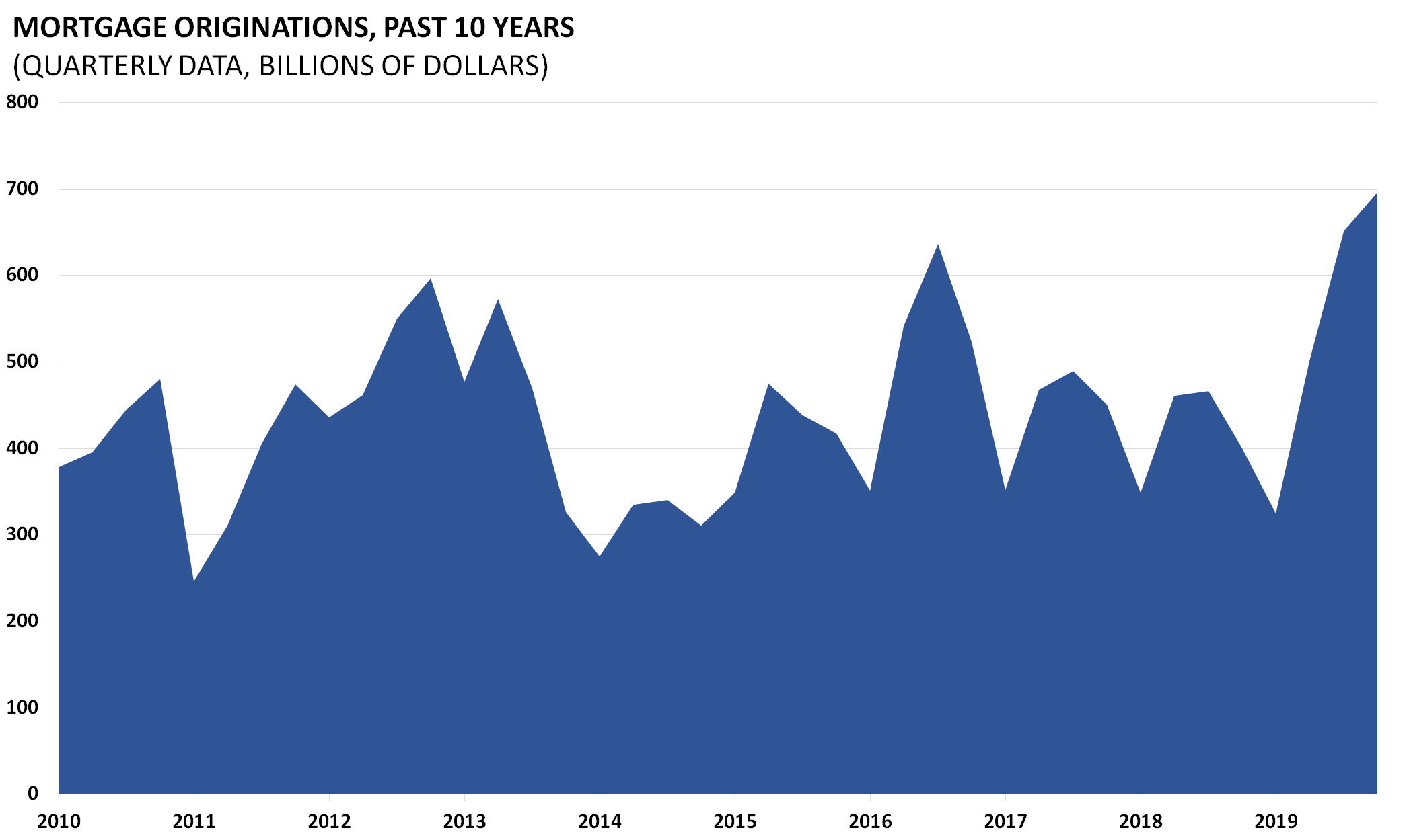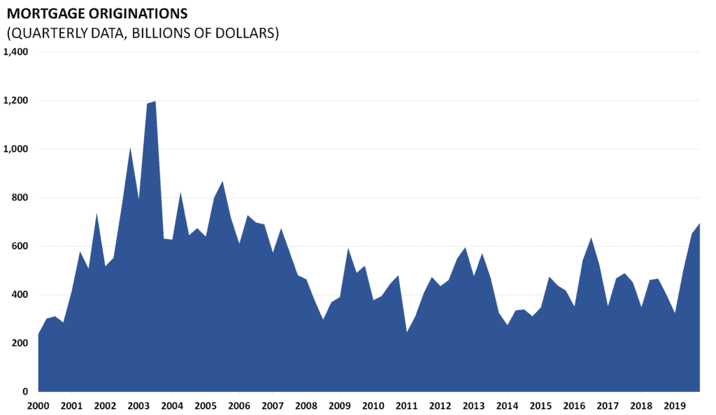 The Mortgage Bankers Association releases data on the number of mortgages that they forecast will be originated each quarter. Mortgages originations, shown in dollars, indicates the level of market activity. Divided here between original purchases and refinances provides even greater insight into the types of originations and the condition of the market recovery.