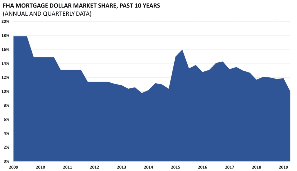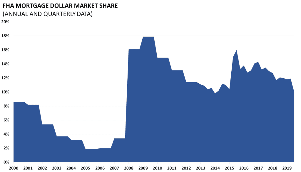 The Federal Housing Administration insures private mortgage lenders against the possibility of default. FHA insured loans are a form of federal assistance. The FHA market share therefore indicates the strength of private versus public mortgage insurance.
