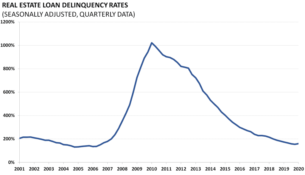 Delinquency rates on all loans secured by real estate and commercial banks are released by the Board of Governors of the Federal Reserve. Seasonally adjusted, the measure indicates the percentage of borrowers who have been unable to make timely payments on their loans. This measure is reflective of the overall economy and macroeconomic factors like unemployment. This data is released quarterly with the Fed report on “Charge-Off and Delinquency Rates on Loans and Leases at Commercial Banks.”
