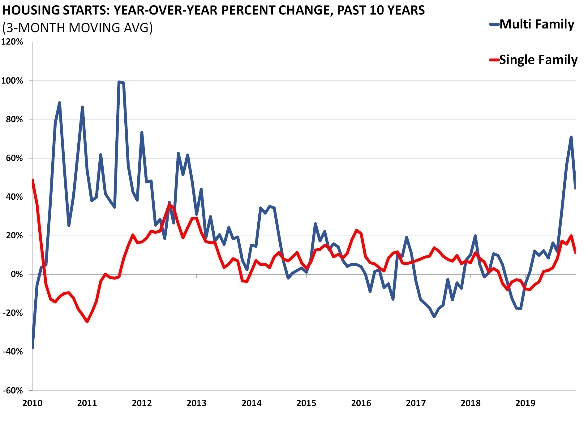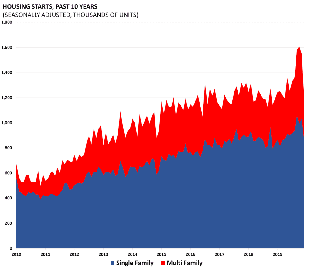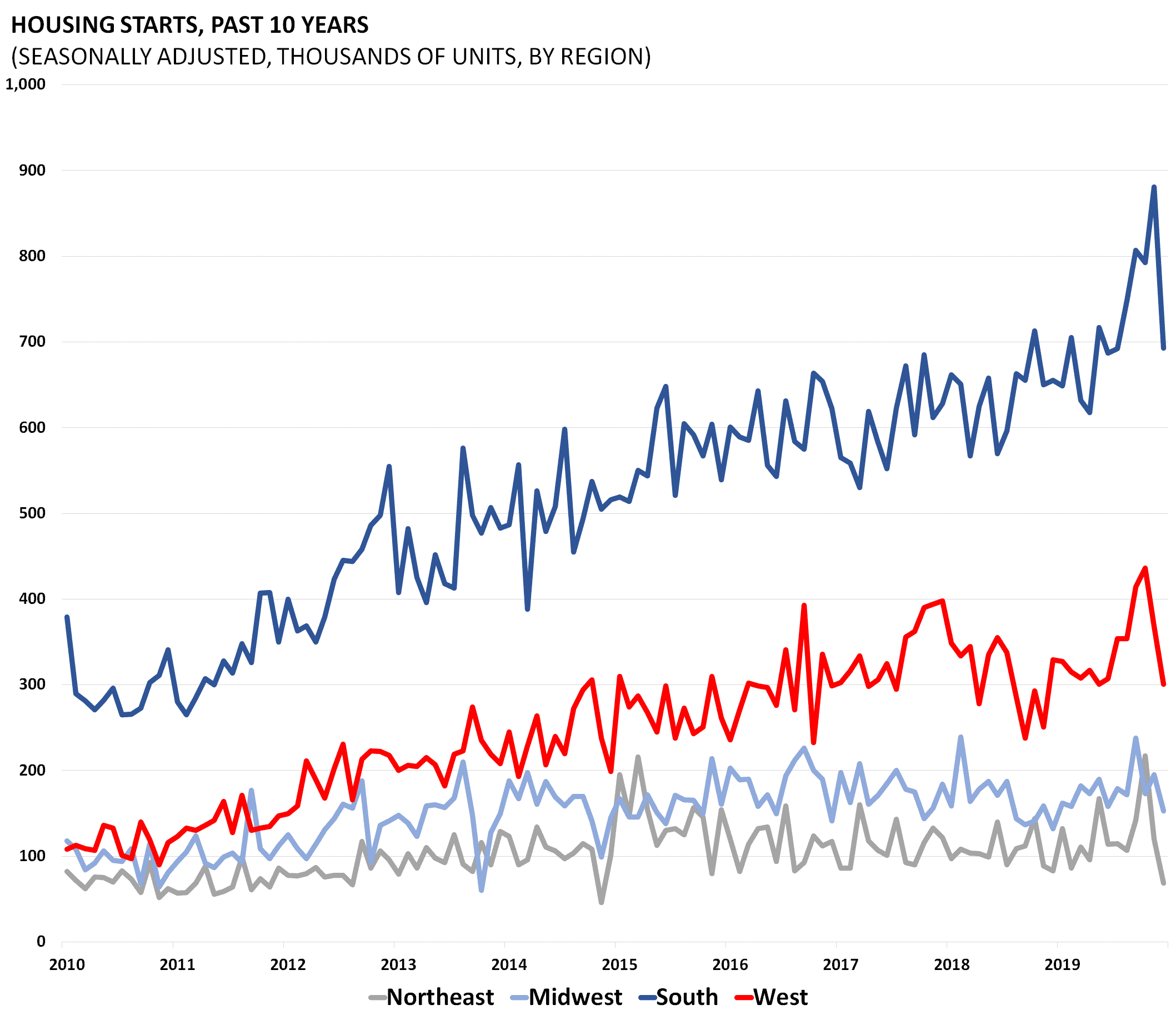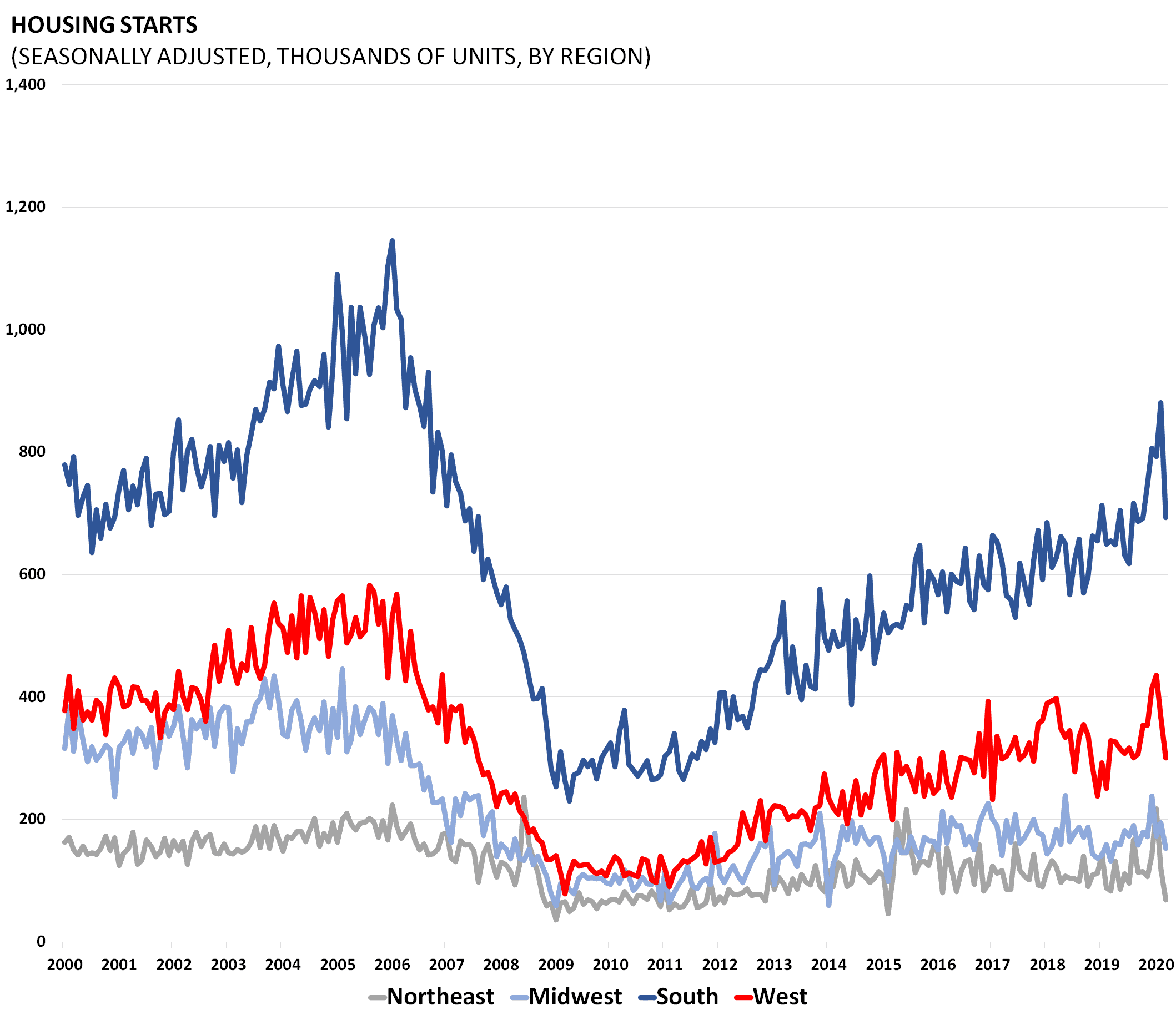 Housing starts and permits data are released by the Census Bureau as part of its “New Residential Construction” report. Starts and permits are important indicators on the supply side of the housing market. Housing starts are seasonally adjusted and count only privately-owned housing starts.