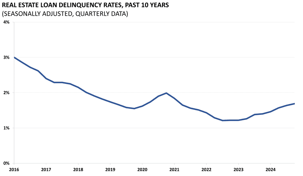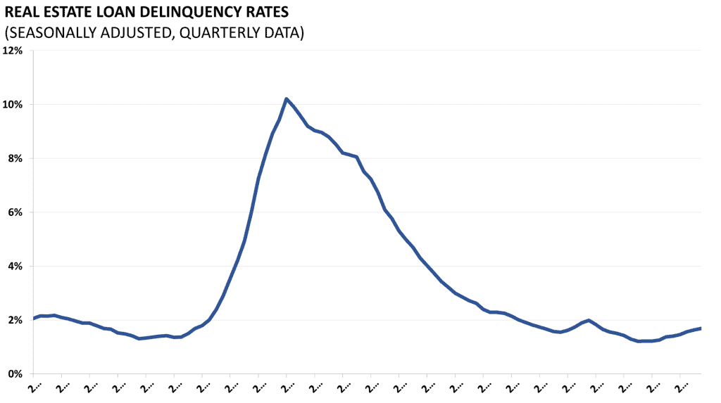 Delinquency rates on all loans secured by real estate and commercial banks are released by the Board of Governors of the Federal Reserve. Seasonally adjusted, the measure indicates the percentage of borrowers who have been unable to make timely payments on their loans. This measure is reflective of the overall economy and macroeconomic factors like unemployment. This data is released quarterly with the Fed report on “Charge-Off and Delinquency Rates on Loans and Leases at Commercial Banks.”