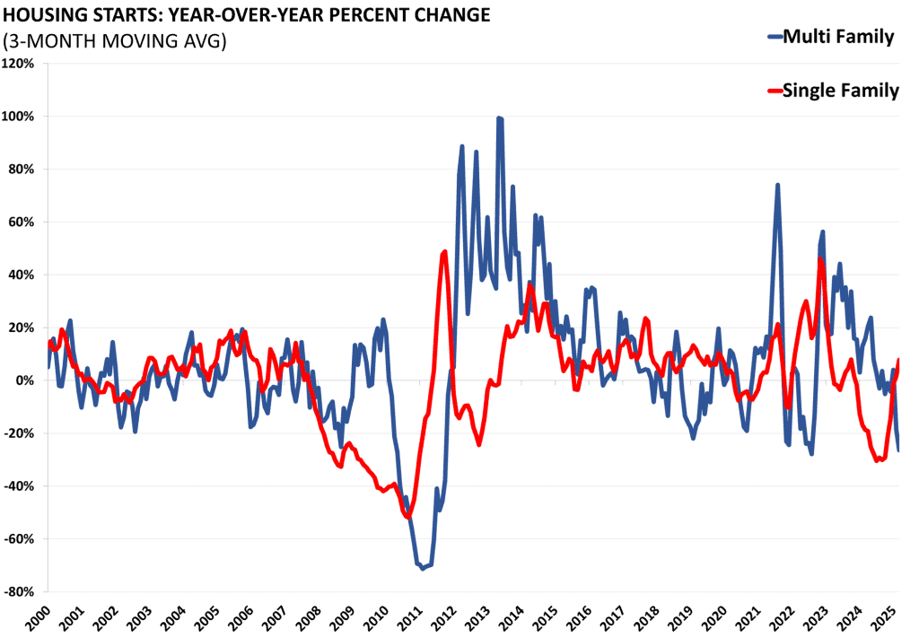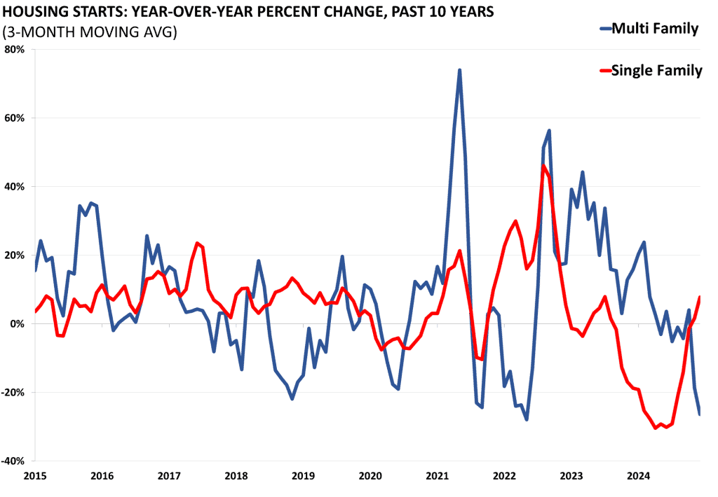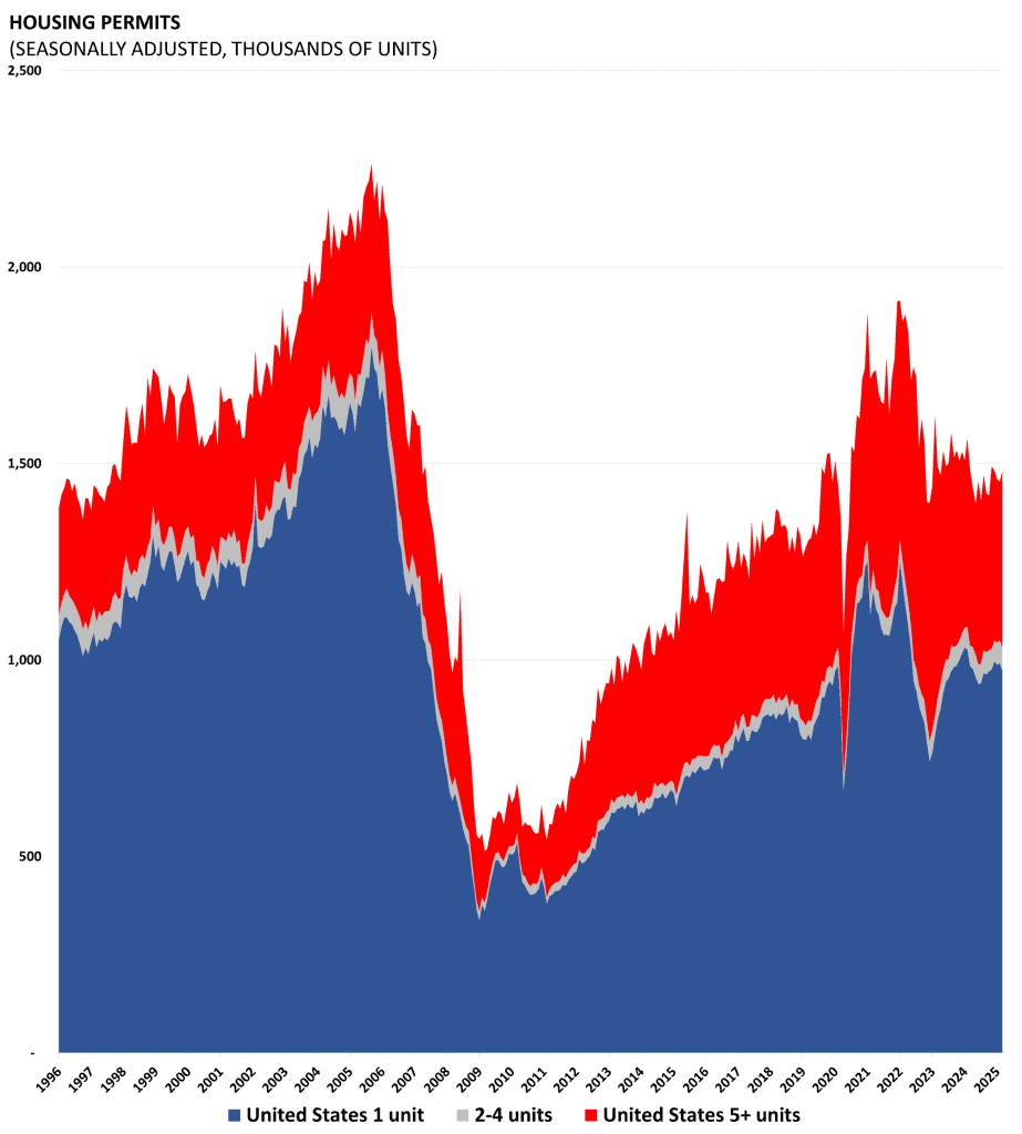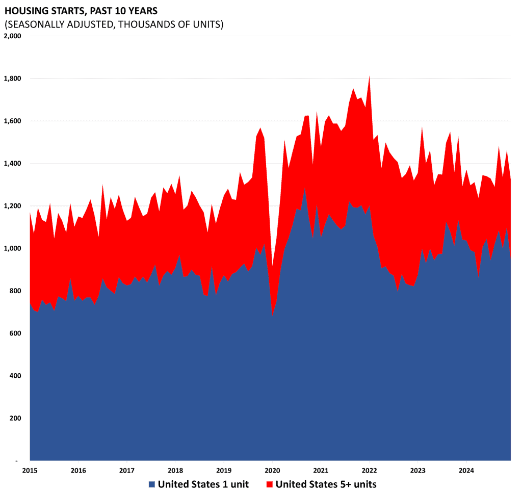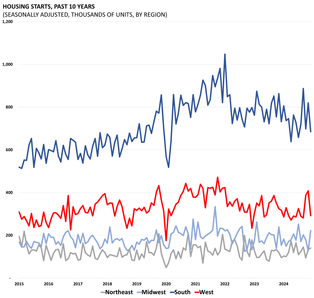 Housing starts and permits data are released by the Census Bureau as part of its “New Residential Construction” report. Starts and permits are important indicators on the supply side of the housing market. Housing starts are seasonally adjusted and count only privately-owned housing starts.