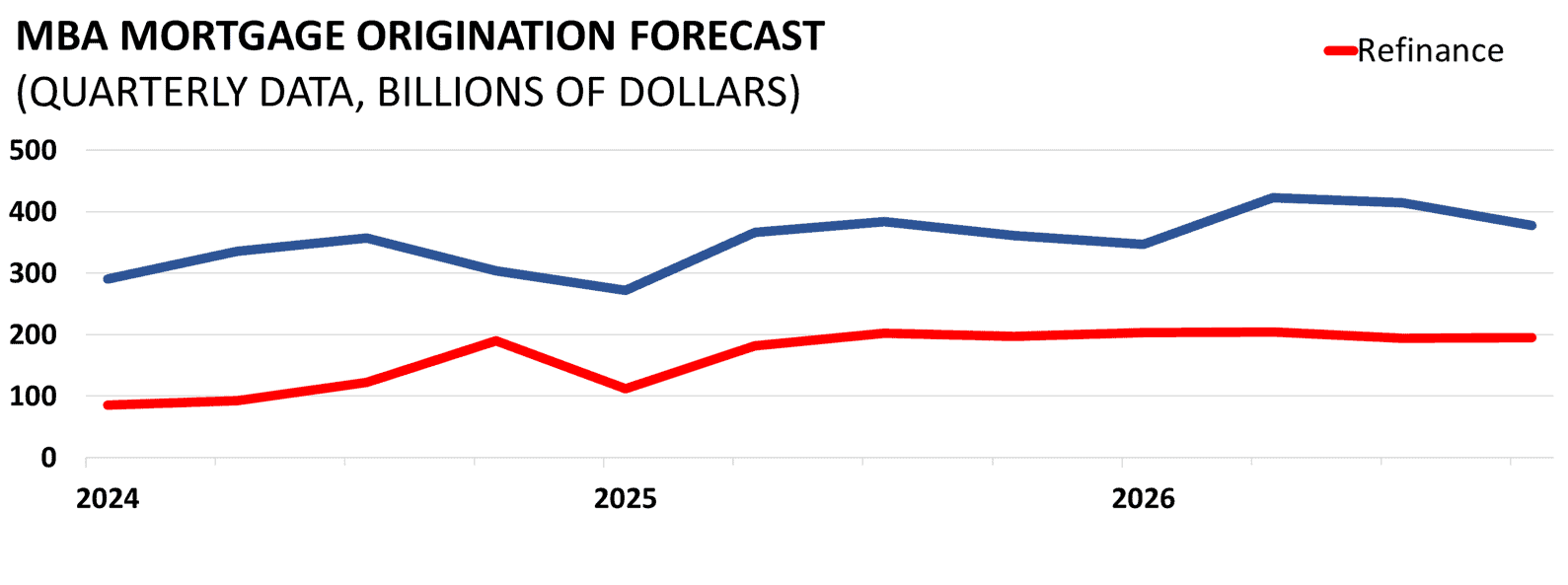 The Mortgage Bankers Association releases data on the number of mortgages that they forecast will be originated each quarter. Mortgages originations, shown in dollars, indicates the level of market activity. Divided here between original purchases and refinances provides even greater insight into the types of originations and the condition of the market recovery.