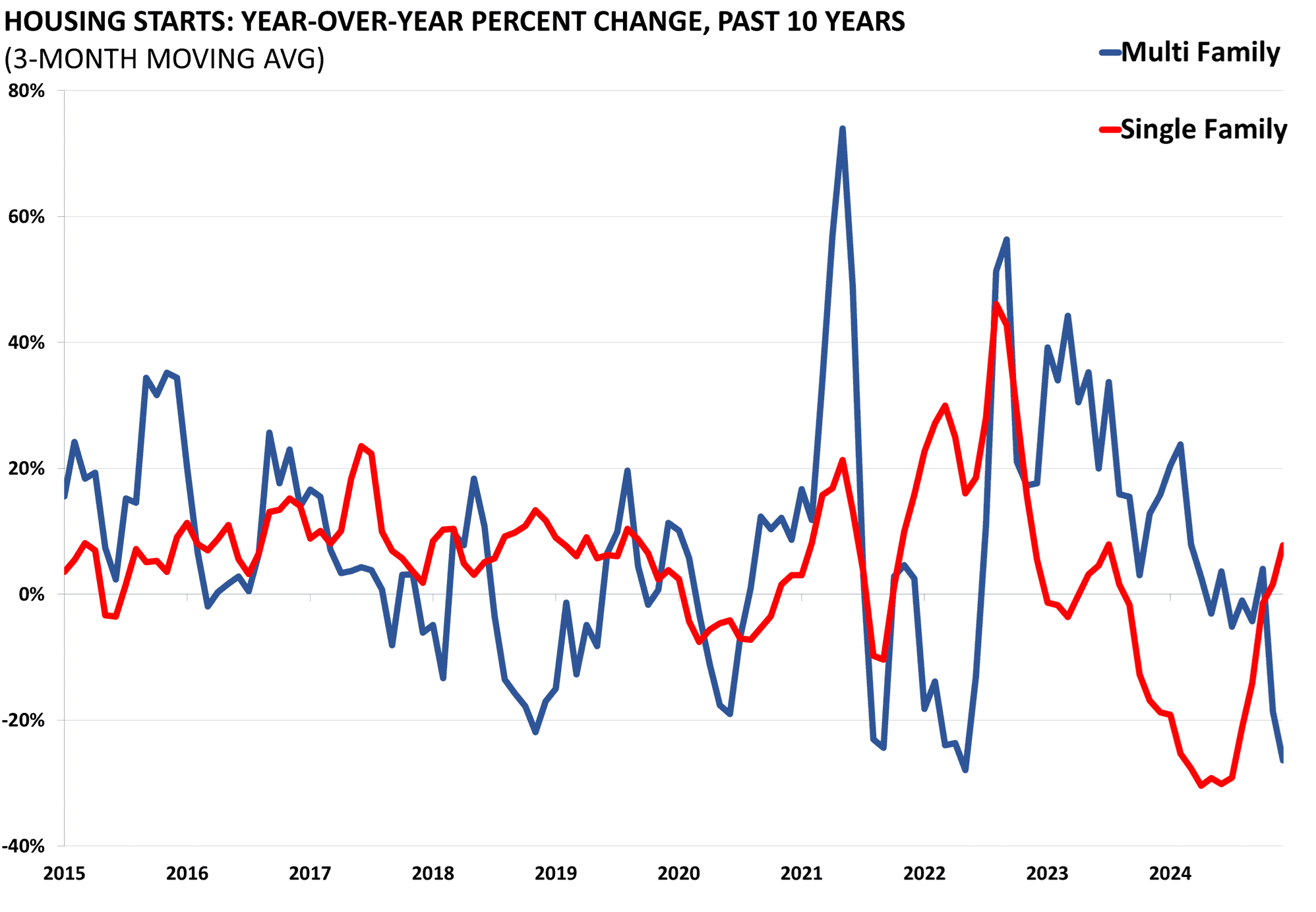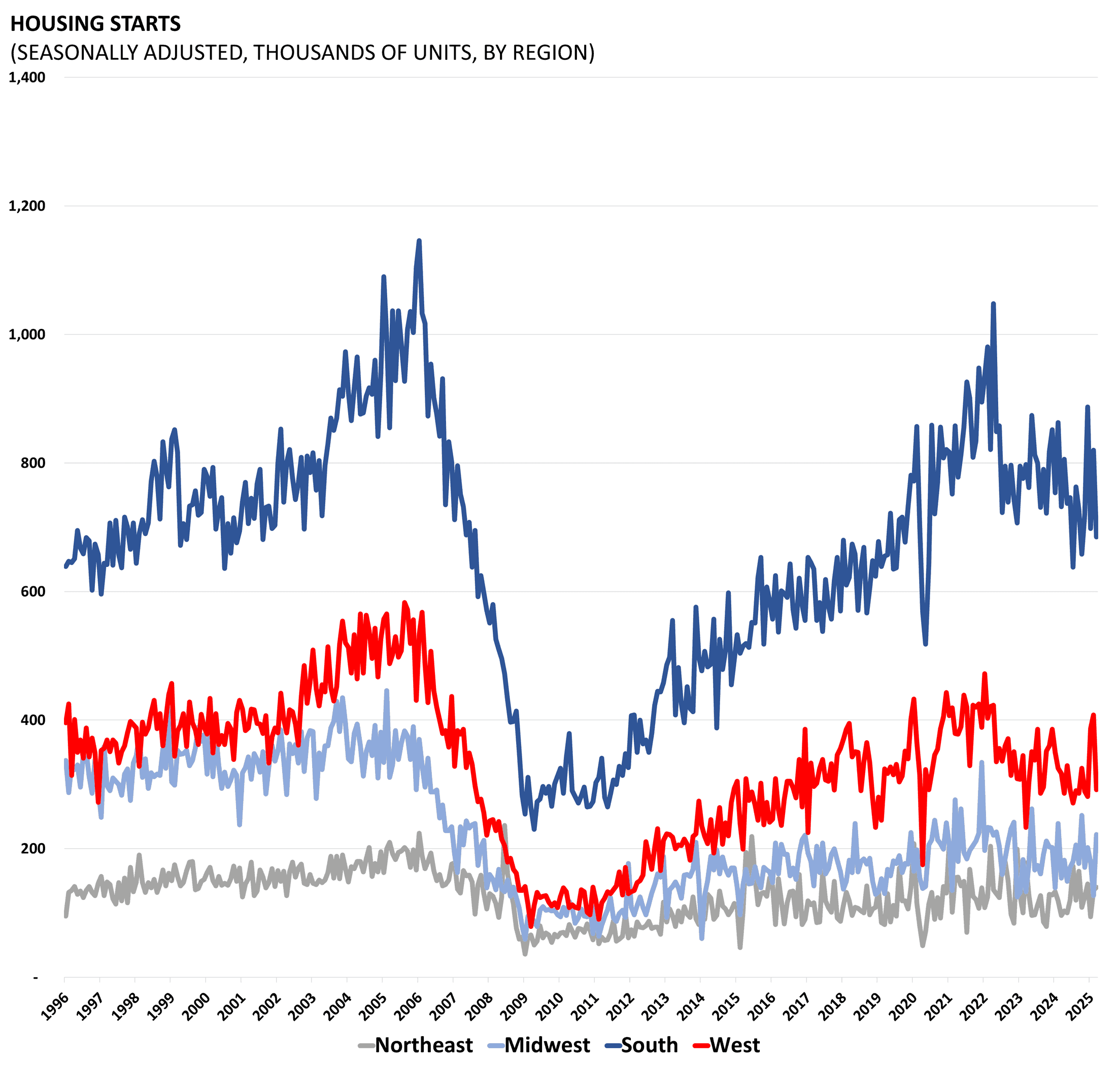 Housing starts and permits data are released by the Census Bureau as part of its “New Residential Construction” report. Starts and permits are important indicators on the supply side of the housing market. Housing starts are seasonally adjusted and count only privately-owned housing starts.