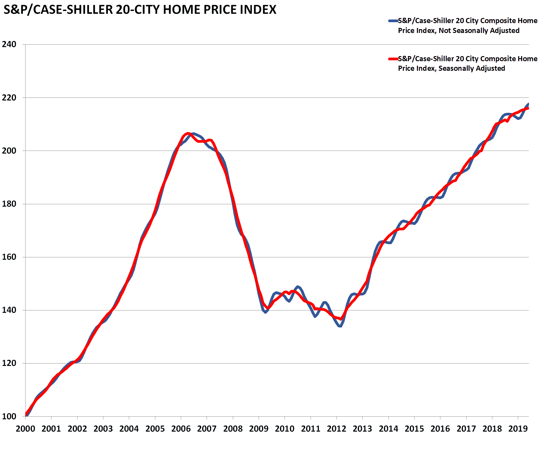 The S&P/Case-Shiller home price index is released near the end of each month for the month two months previously. The release is an index of home prices in 20 of the largest metropolitan areas across the country. It is a reputable and widely reported indicator of home prices.