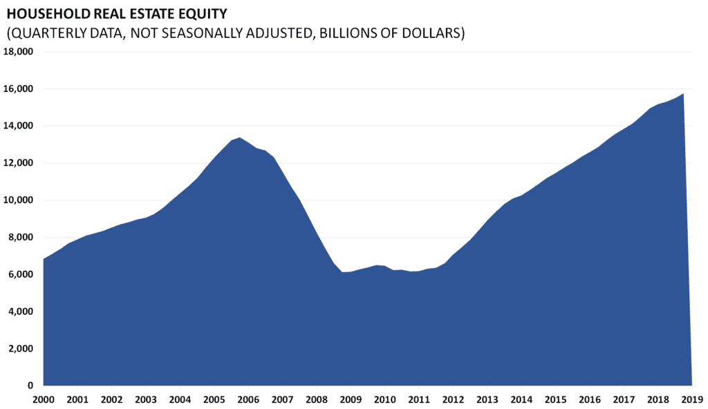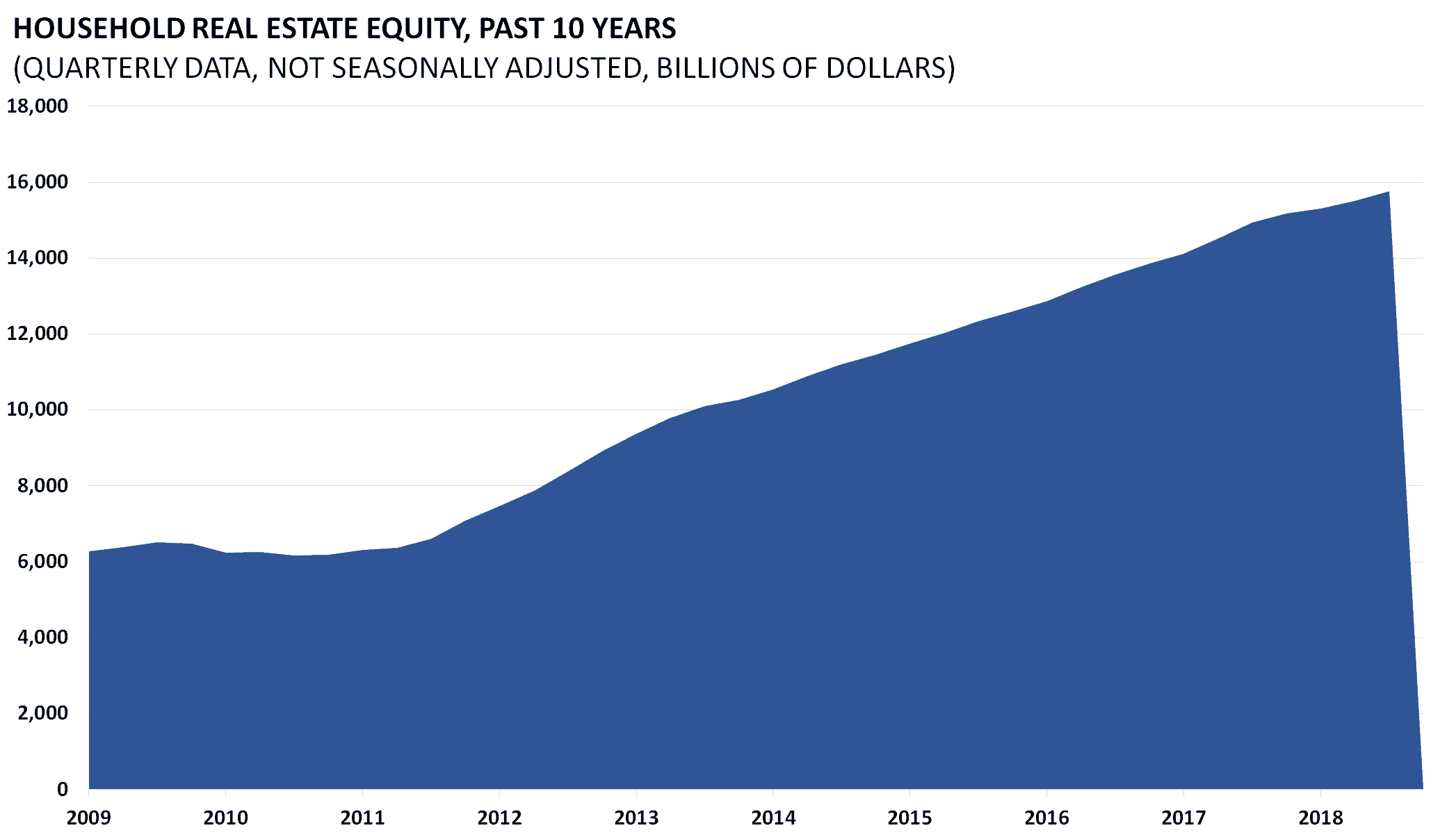 The amount of household real estate equity is the total net worth of household real estate holdings in the United States. As home prices plummeted with the bursting of the housing bubble, home equity plummeted. The loss in equity cannot be regained without economic growth and higher home prices. Household home equity data is released quarterly as part of the Z.1 Flow of Funds Accounts of the United States by the Board of Governors of the Federal Reserve System.