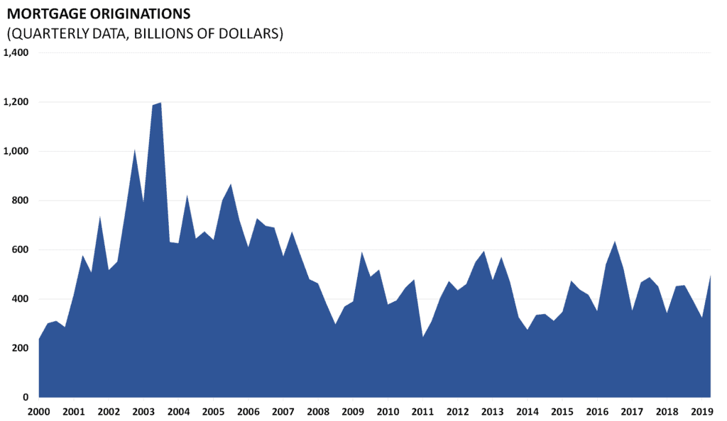 The Mortgage Bankers Association releases data on the number of mortgages that they forecast will be originated each quarter. Mortgages originations, shown in dollars, indicates the level of market activity. Divided here between original purchases and refinances provides even greater insight into the types of originations and the condition of the market recovery.