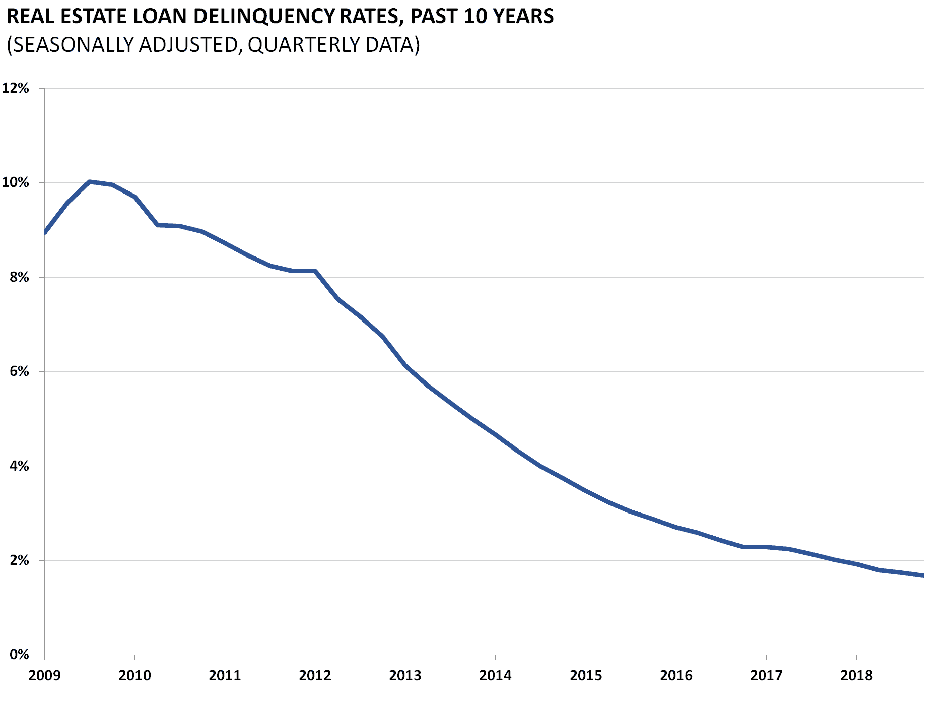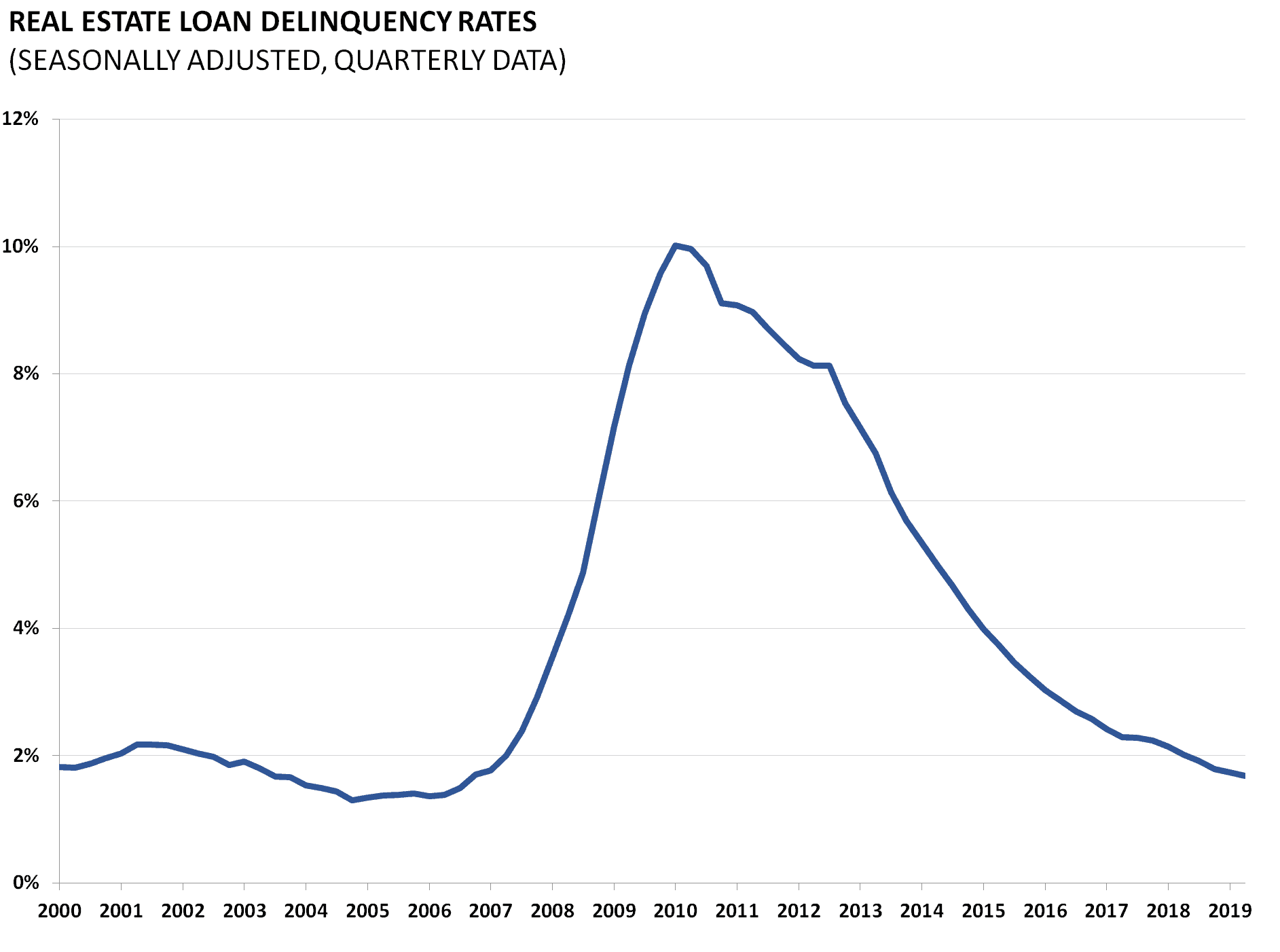 Delinquency rates on all loans secured by real estate and commercial banks are released by the Board of Governors of the Federal Reserve. Seasonally adjusted, the measure indicates the percentage of borrowers who have been unable to make timely payments on their loans. This measure is reflective of the overall economy and macroeconomic factors like unemployment. This data is released quarterly with the Fed report on “Charge-Off and Delinquency Rates on Loans and Leases at Commercial Banks.”
