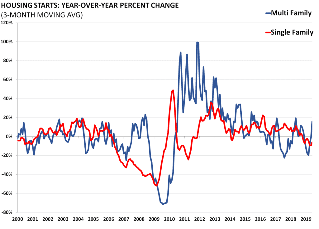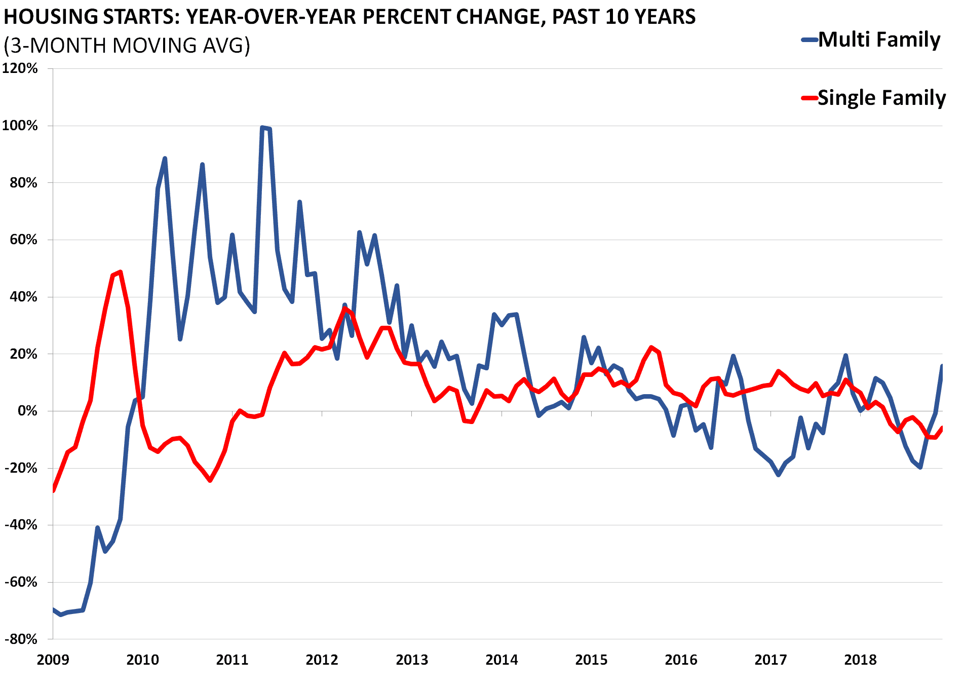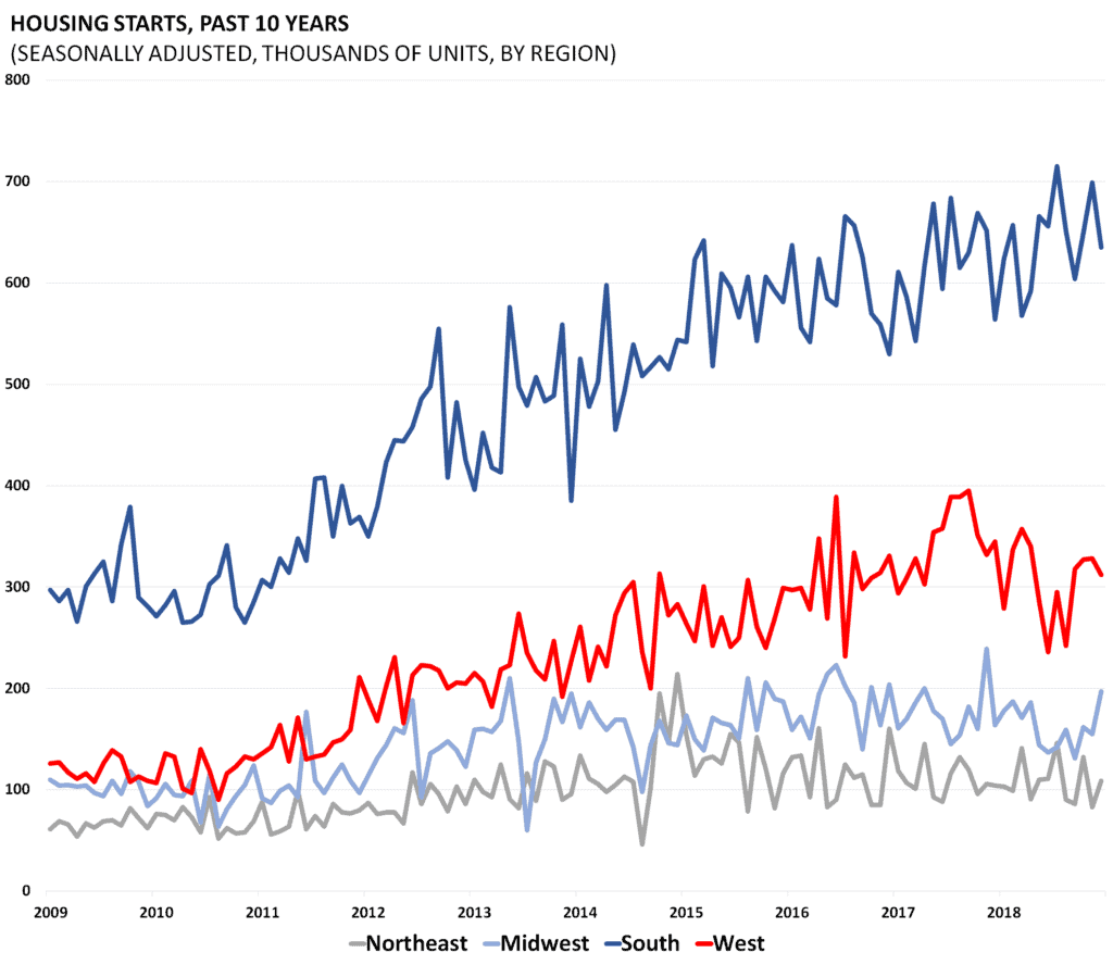 Housing starts and permits data are released by the Census Bureau as part of its “New Residential Construction” report. Starts and permits are important indicators on the supply side of the housing market. Housing starts are seasonally adjusted and count only privately-owned housing starts.