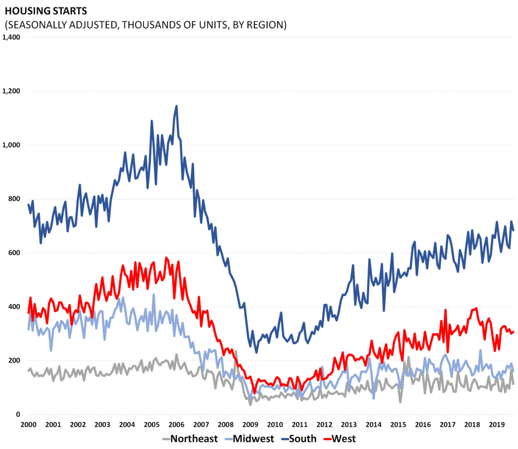 Housing starts and permits data are released by the Census Bureau as part of its “New Residential Construction” report. Starts and permits are important indicators on the supply side of the housing market. Housing starts are seasonally adjusted and count only privately-owned housing starts.