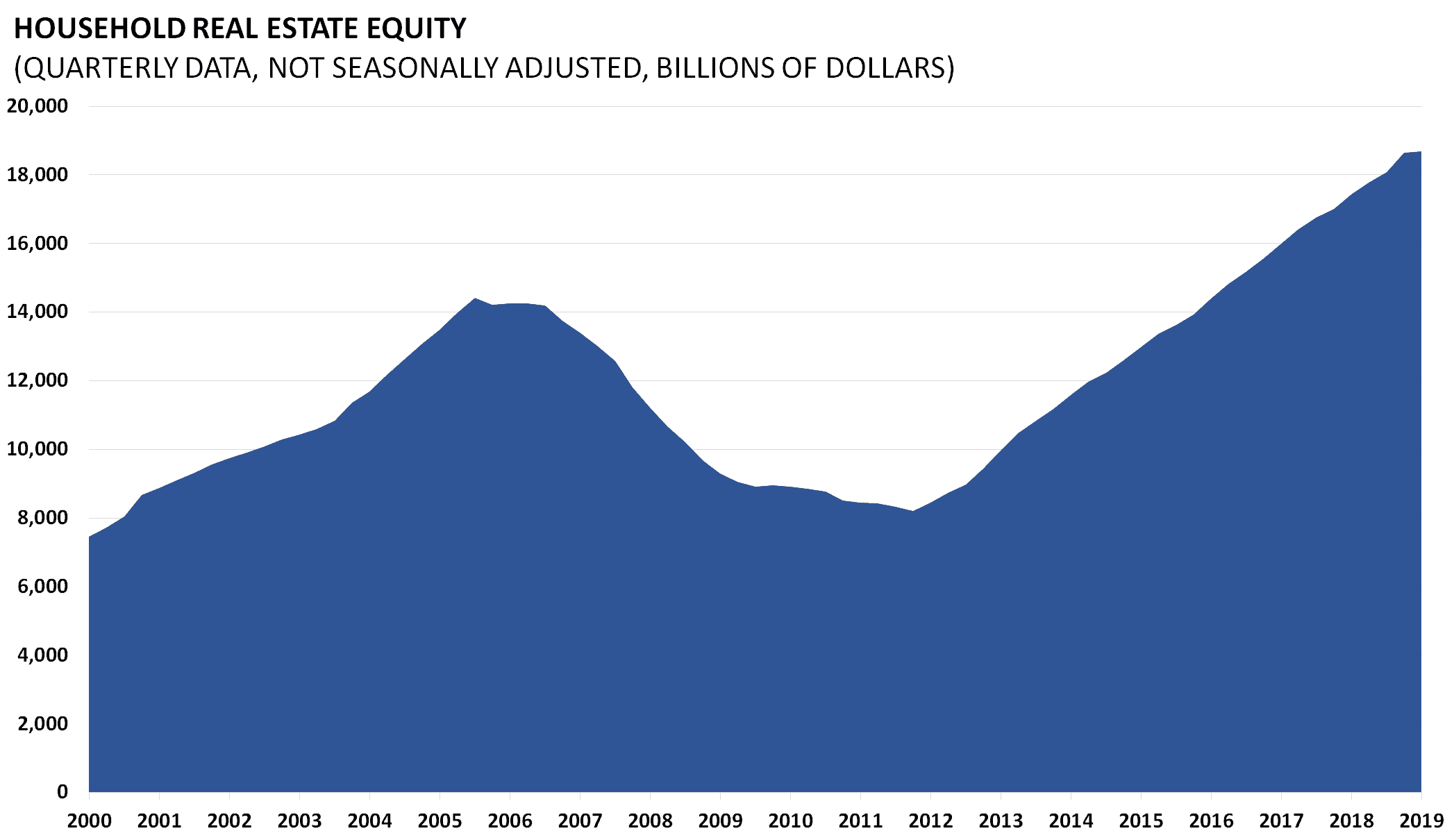 The amount of household real estate equity is the total net worth of household real estate holdings in the United States. As home prices plummeted with the bursting of the housing bubble, home equity plummeted. The loss in equity cannot be regained without economic growth and higher home prices. Household home equity data is released quarterly as part of the Z.1 Flow of Funds Accounts of the United States by the Board of Governors of the Federal Reserve System.