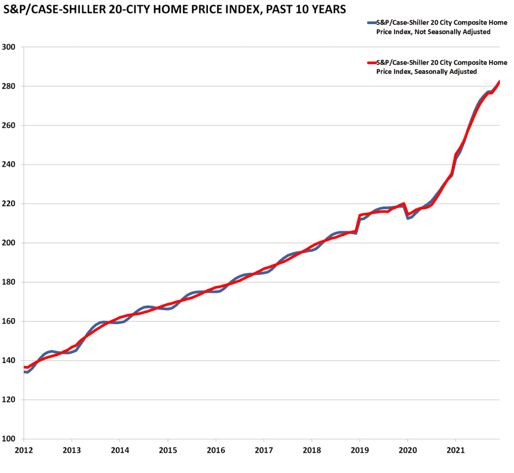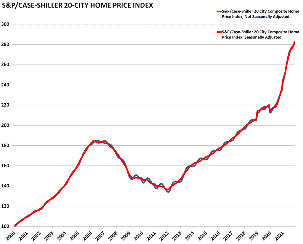 The S&P/Case-Shiller home price index is released near the end of each month for the month two months previously. The release is an index of home prices in 20 of the largest metropolitan areas across the country. It is a reputable and widely reported indicator of home prices.