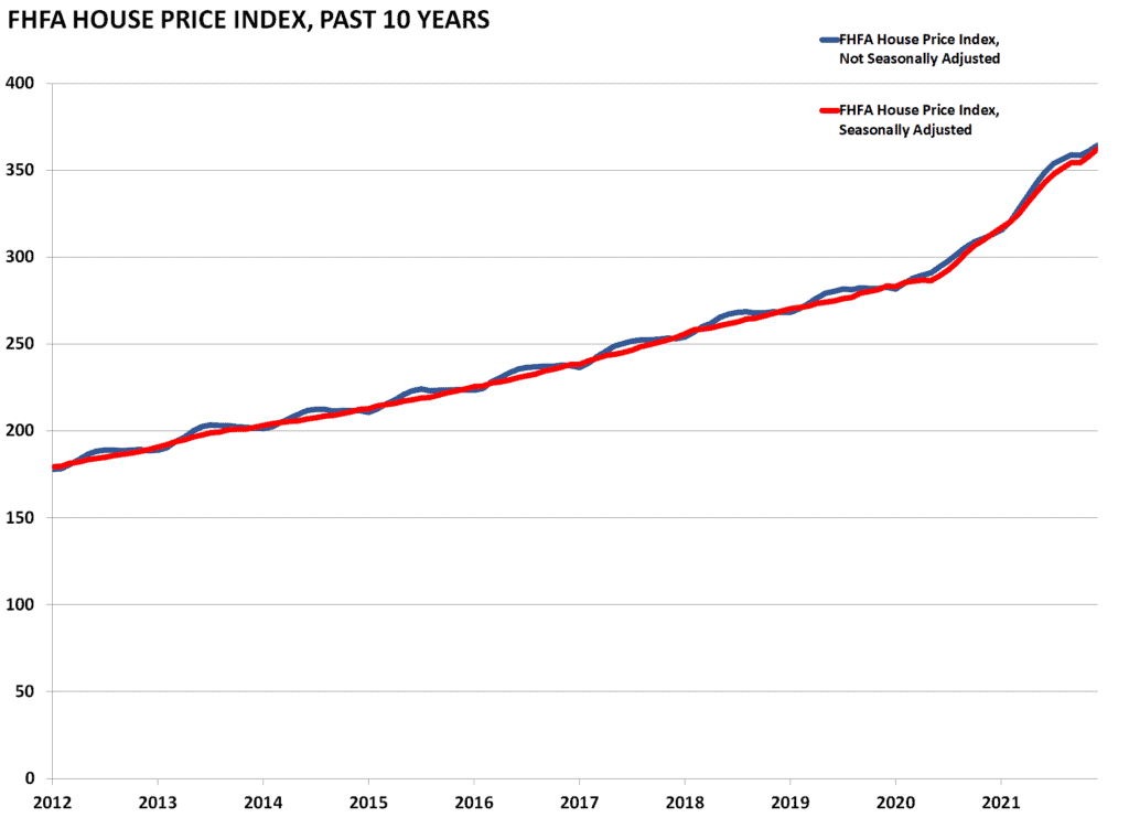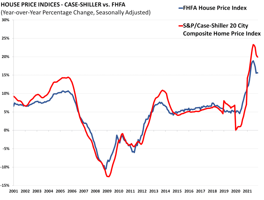 Similar to the Case-Shiller Index, the Federal Housing Finance Agency’s House Price Index (HPI) is a broad measure of single-family house prices. Information for the index is derived from properties whose mortgages have been purchased or securitized by Fannie Mae or Freddie Mac from all 50 states and the DC area.