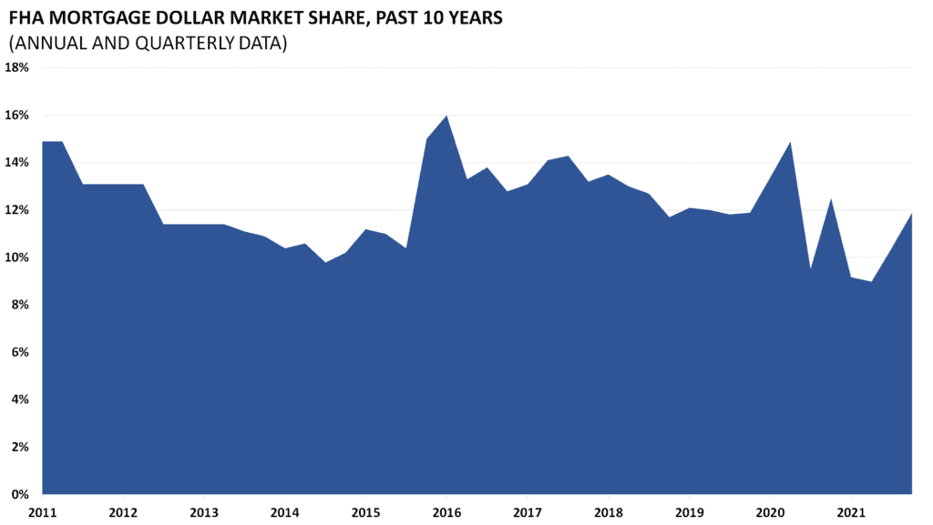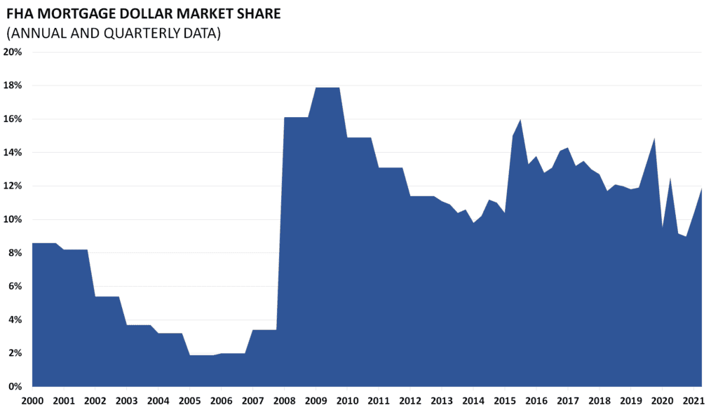 The Federal Housing Administration insures private mortgage lenders against the possibility of default. FHA insured loans are a form of federal assistance. The FHA market share therefore indicates the strength of private versus public mortgage insurance.