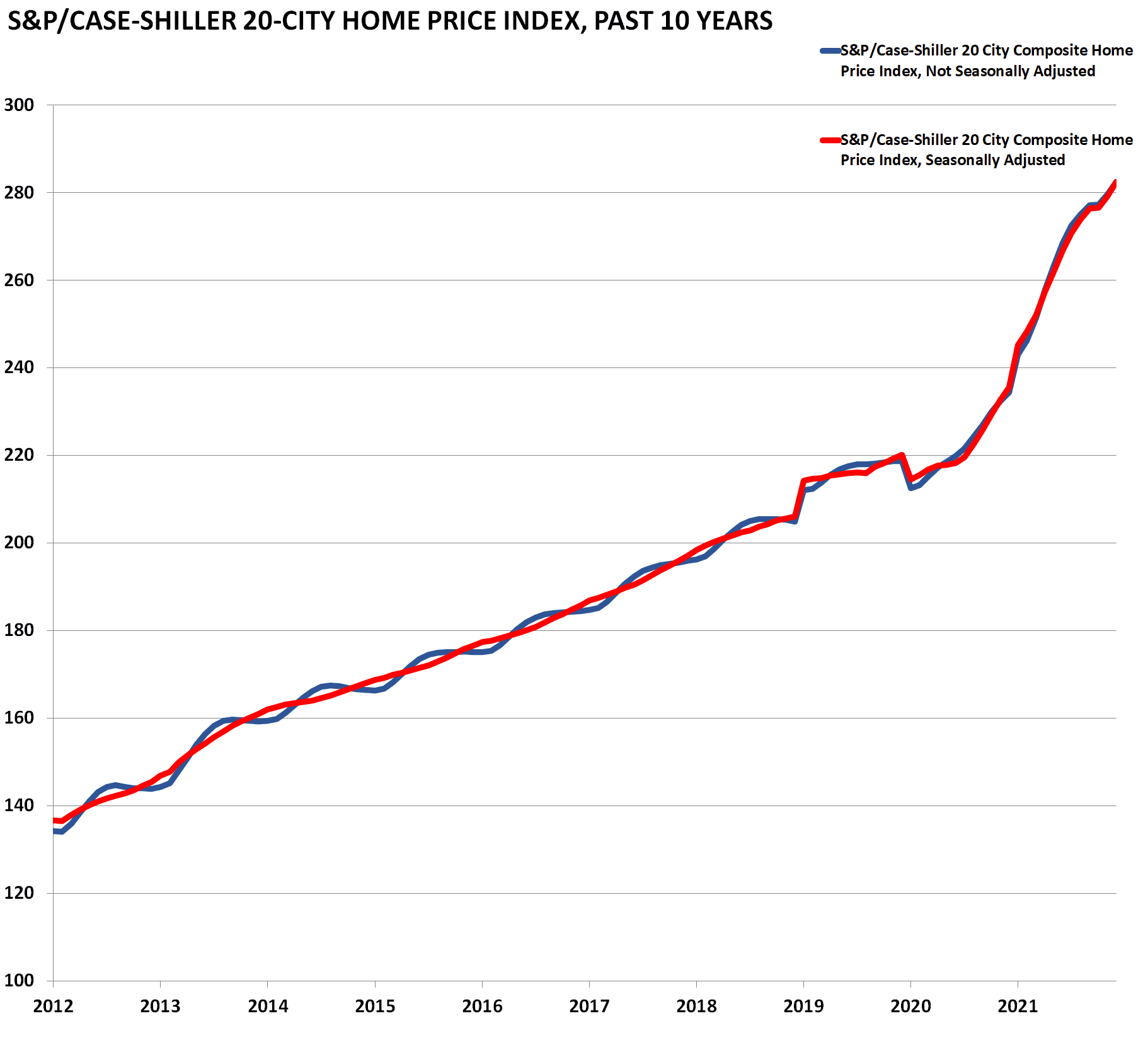 The S&P/Case-Shiller home price index is released near the end of each month for the month two months previously. The release is an index of home prices in 20 of the largest metropolitan areas across the country. It is a reputable and widely reported indicator of home prices.