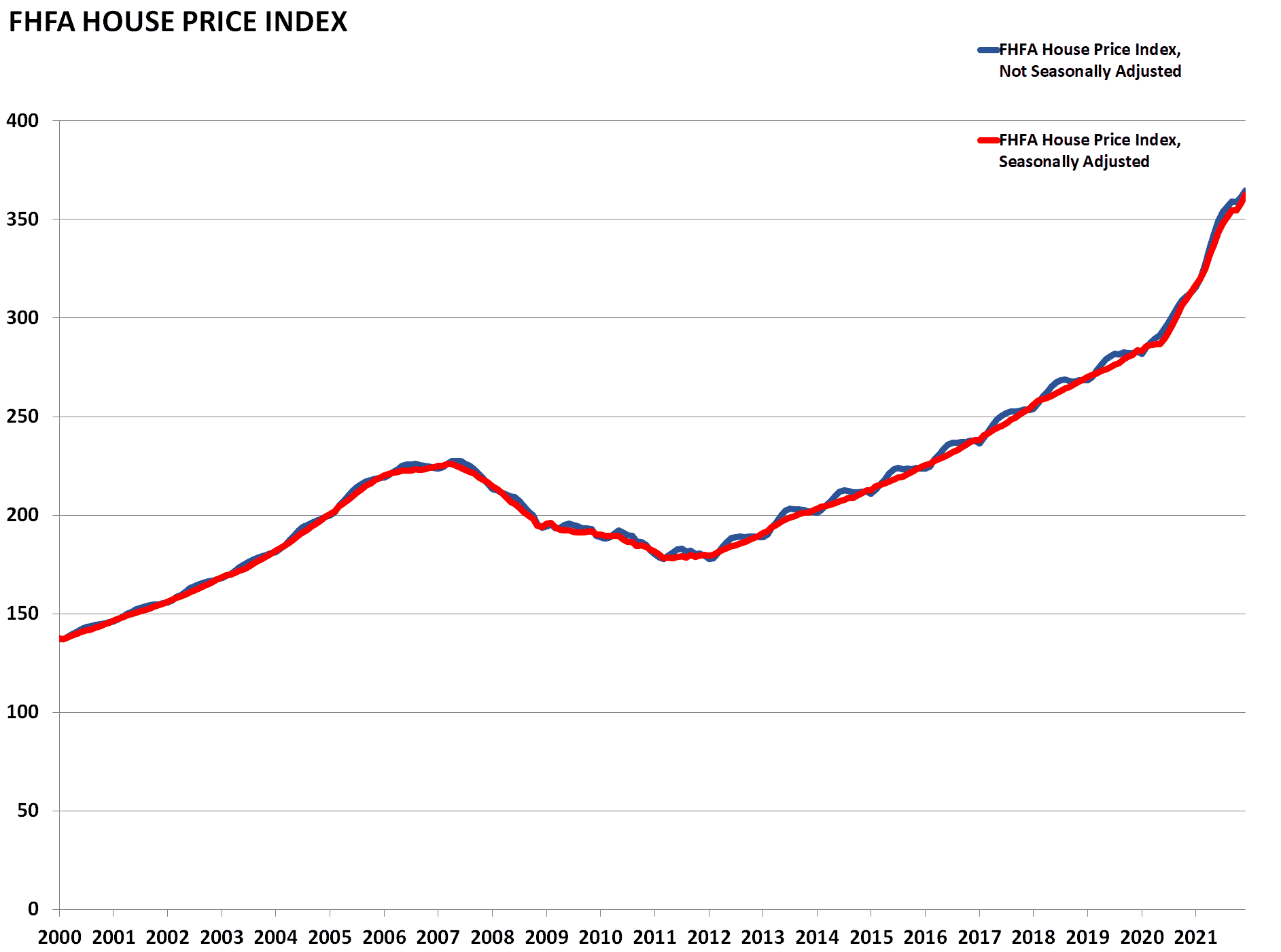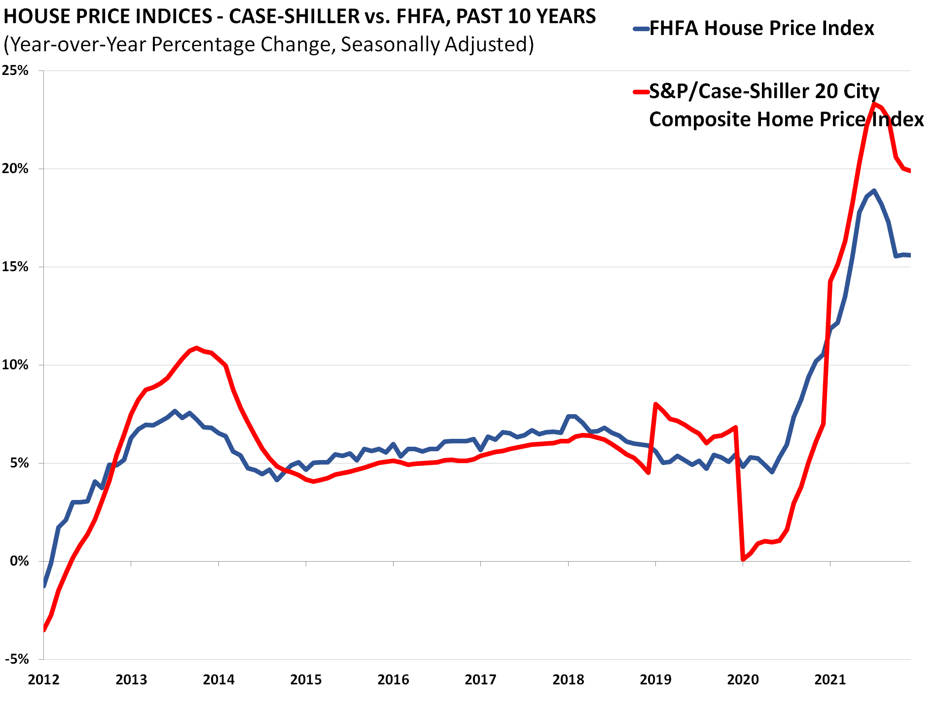 Similar to the Case-Shiller Index, the Federal Housing Finance Agency’s House Price Index (HPI) is a broad measure of single-family house prices. Information for the index is derived from properties whose mortgages have been purchased or securitized by Fannie Mae or Freddie Mac from all 50 states and the DC area.