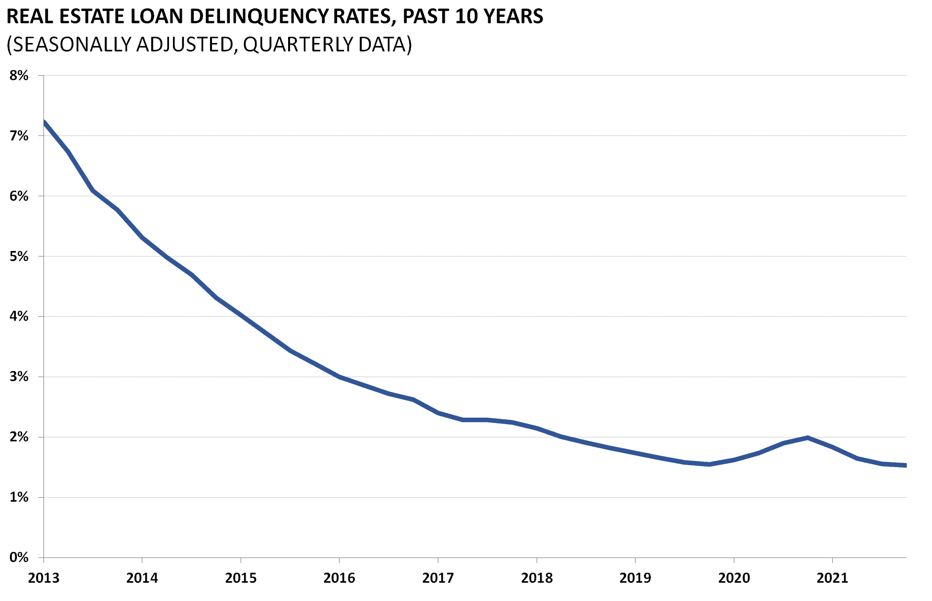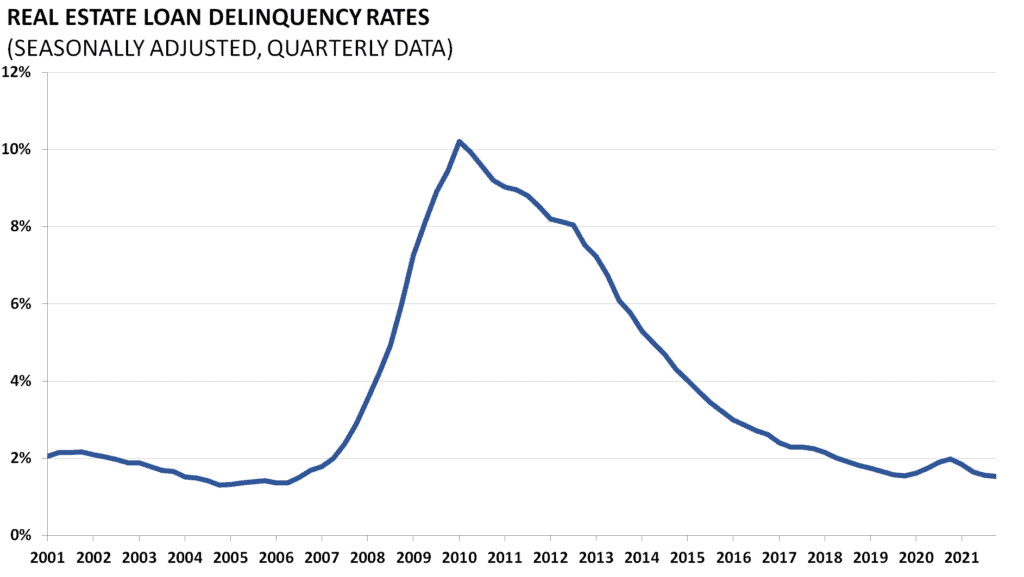 Delinquency rates on all loans secured by real estate and commercial banks are released by the Board of Governors of the Federal Reserve. Seasonally adjusted, the measure indicates the percentage of borrowers who have been unable to make timely payments on their loans. This measure is reflective of the overall economy and macroeconomic factors like unemployment. This data is released quarterly with the Fed report on “Charge-Off and Delinquency Rates on Loans and Leases at Commercial Banks.”