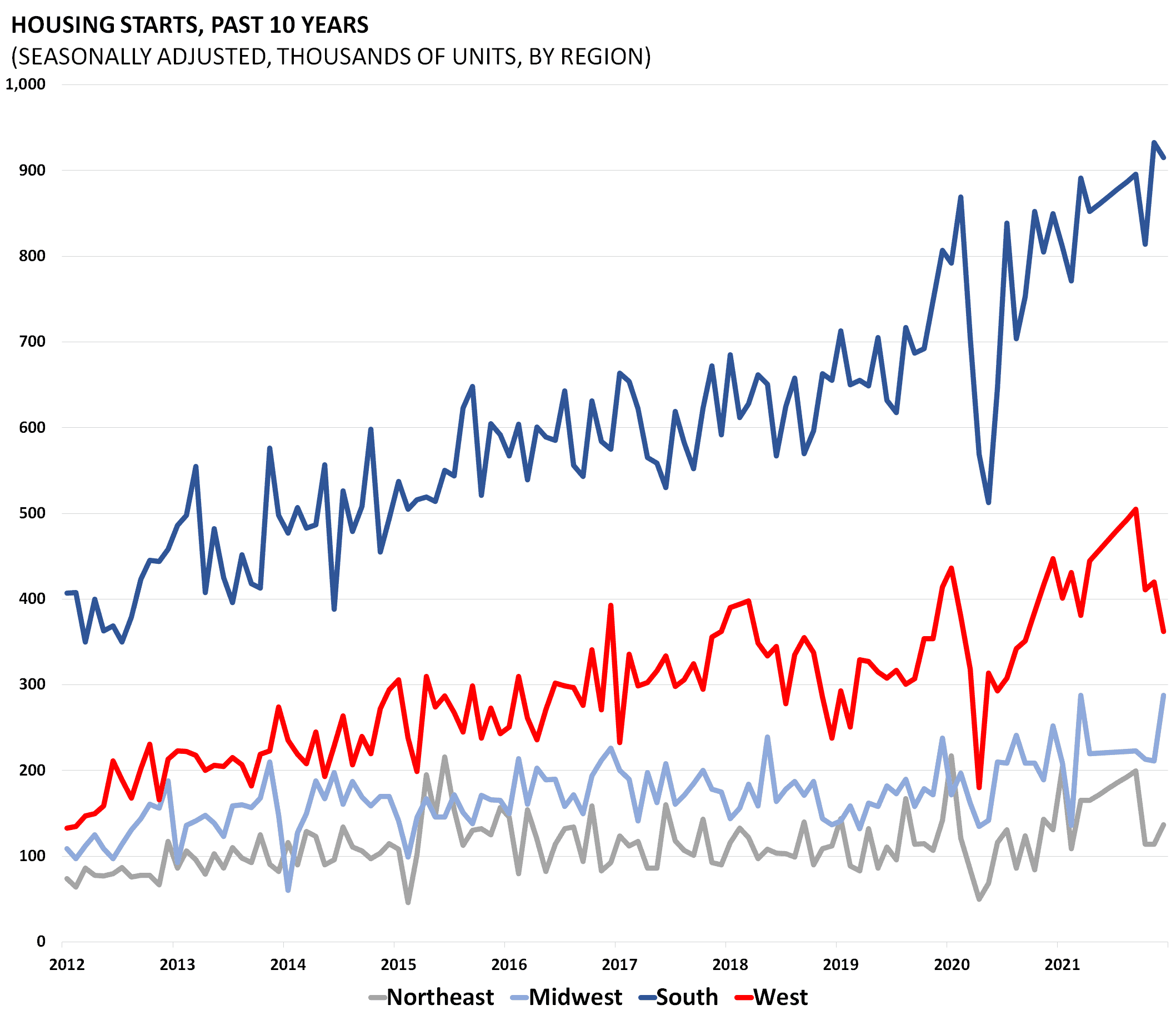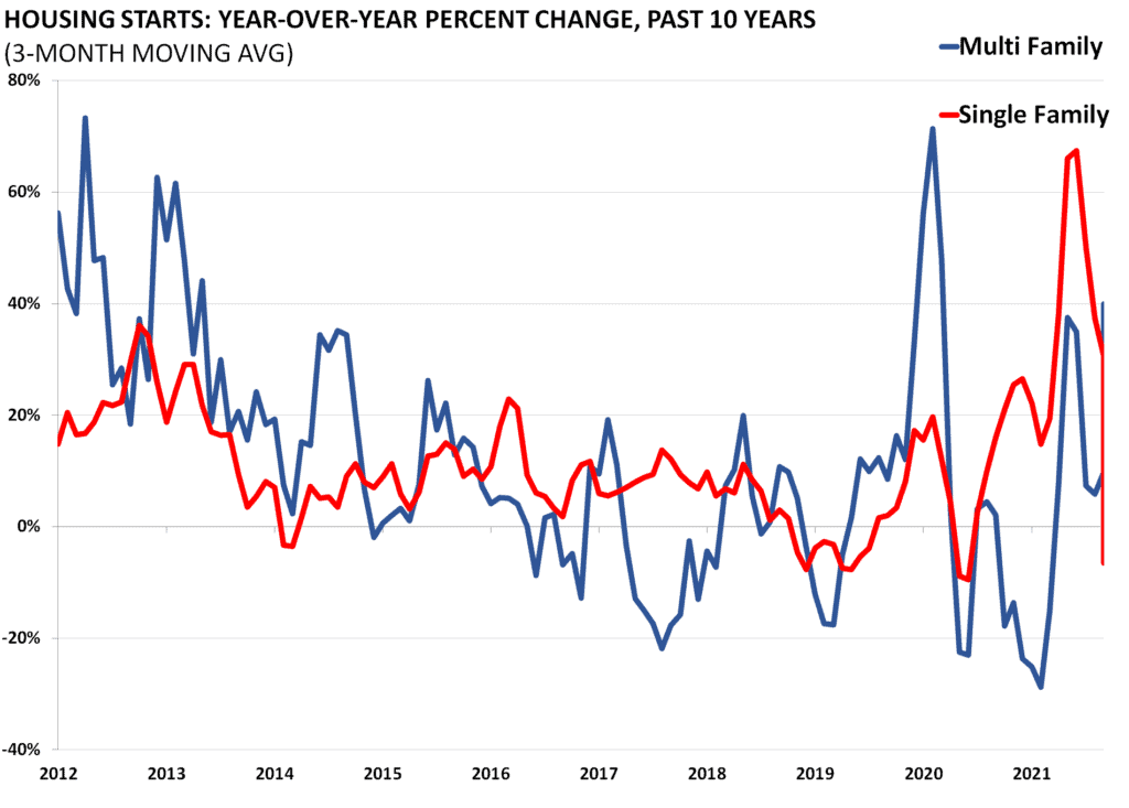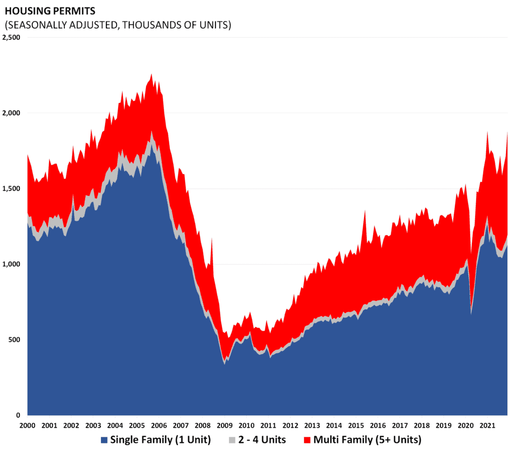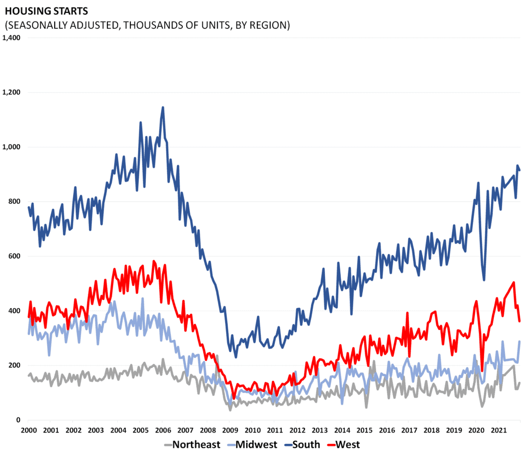 Housing starts and permits data are released by the Census Bureau as part of its “New Residential Construction” report. Starts and permits are important indicators on the supply side of the housing market. Housing starts are seasonally adjusted and count only privately-owned housing starts.