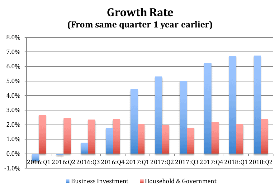 The chart below takes a look at these policies. The centerpiece of the TCJA is the improved taxation of business income and the investment incentives. Since it has been only seven months since passage and because the Treasury has not even finalized the regulations that will implement the law, there is no reason to see the full effect just yet. But it is suggestive that non-residential fixed investment (“business investment,” blue bars) has improved steadily and jumped immediately after the passage of the bill in 2017:Q4.