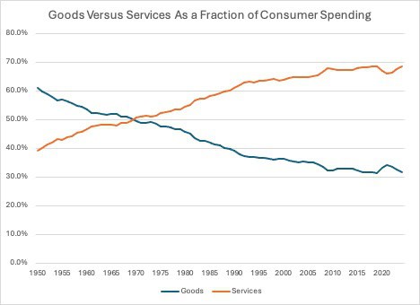 The problem with this logic is that it isn’t the 1950s or 1960s anymore. In the 2025 U.S. economy, the vast bulk – nearly 70 percent – of consumer spending is on purchases of services. (See the chart below.) Services are made in the United States. Imports of services are not an issue. If you want to make things cheaper, focus on key services such as shelter services, as well as the affordable housing crisis.