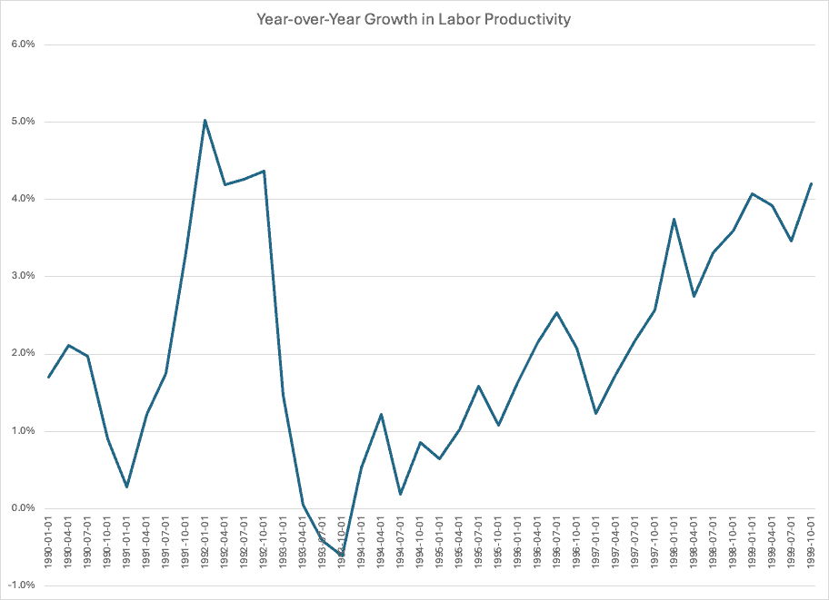 Certainly, recent productivity growth has been quite rapid – a 4.9 percent annual rate in the 3rd quarter of 2025. But is that a durable, seismic shift that policymakers can count on for years to come? Or is it another blip in the notoriously noisy productivity data? Proponents of the former view point to the late 1990s and then-Fed Chair Alan Greenspan’s bet on productivity growth. Those data are reproduced below. At what point would one be confident that there is a shift in the underlying growth of productivity?