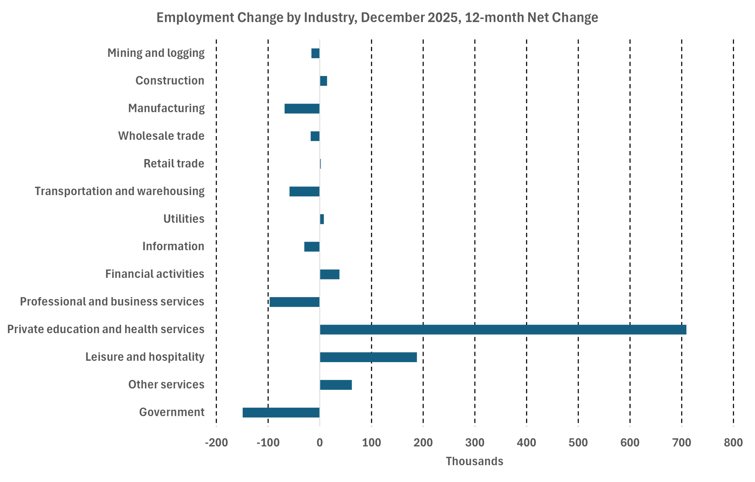 Total nonfarm employment expanded by just 584,000 in 2025, or 49,000 per month. That was a sizable drop from nearly 168,000 per month in 2024 and 217,000 per month in 2023. Moreover, the job gains were anything but evenly distributed. Private education and health services added 709,000. The rest of the economy was flat to negative (see graph below). Manufacturers cut 68,000 jobs while trade and transportation shed nearly 60,000. Is it a coincidence that both sectors are trade-reliant? Doubtful.