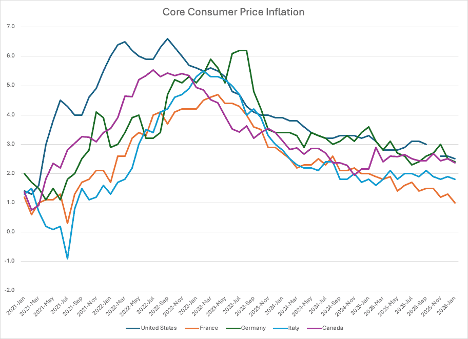It is now 5 years later, and the debate continues as to whose fault it is that U.S. inflation is not back to the 2-percent target. To get a bit of international perspective, the graph below shows the evolution of core (non-food, non-energy) CPI inflation in the United States, France, Germany, Italy, and Canada from 2021 to the present. (Using core makes more sense as the post-Ukraine-invasion data in Europe are heavily influenced by energy costs.) The graph shows that in 2021 and early 2022, inflation rose more sharply and to a higher level in the United States than in the other countries.