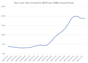 In practice, this is essentially impossible to do. Consider housing. Inflation on shelter costs – which are about one-third of the Consumer Price Index – has risen from 1.6 percent in January 2021 to 4.7 percent at present. That’s a very importantpart of the inflation problem, and it reflects the very sharp rise in housing prices. The year-over-year growth in the nationwide S&P/Case-Shiller house price index is shown in the graph below, and the dramatic run-up in 2021 is obvious.