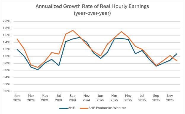 There is good news – these data are uniformly above zero. But there is bad news as well. In particular, there has been a sharp falloff in the growth of real AHE since early 2025. This roughly mirrors the rise in concern about “affordability” in public polling. The lesson is that affordability is not about health insurance premiums, or housing prices, or credit card interest. It is not about any specific price, but rather about the fact that prices overall are rising too fast when compared to wages.