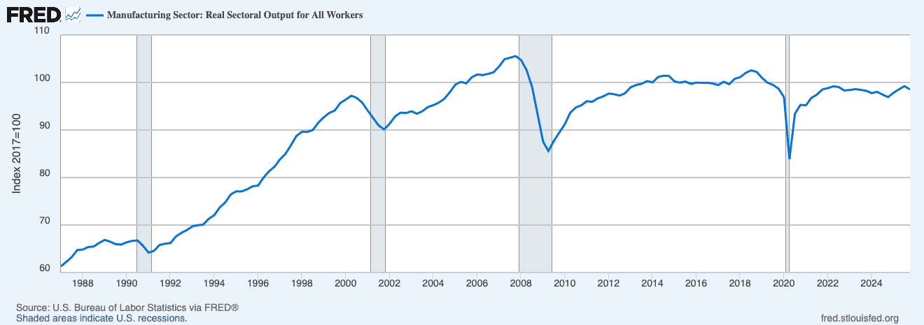 So off Eakonomics (virtually) went for a visit to FRED and a review of the facts. The first is total production (“real sectoral output”) of manufacturers, which remains below the 2017 level and was headed south at the end of 2025.