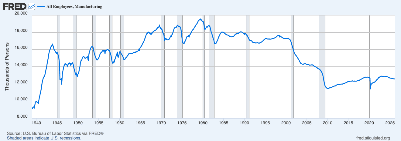 The second is employment in manufacturing. As is well known, manufacturing sector employment is a bit above one-half of its peak, has been in the vicinity of 12 million since the Great Recession, and was also shrinking at the end of 2025.
