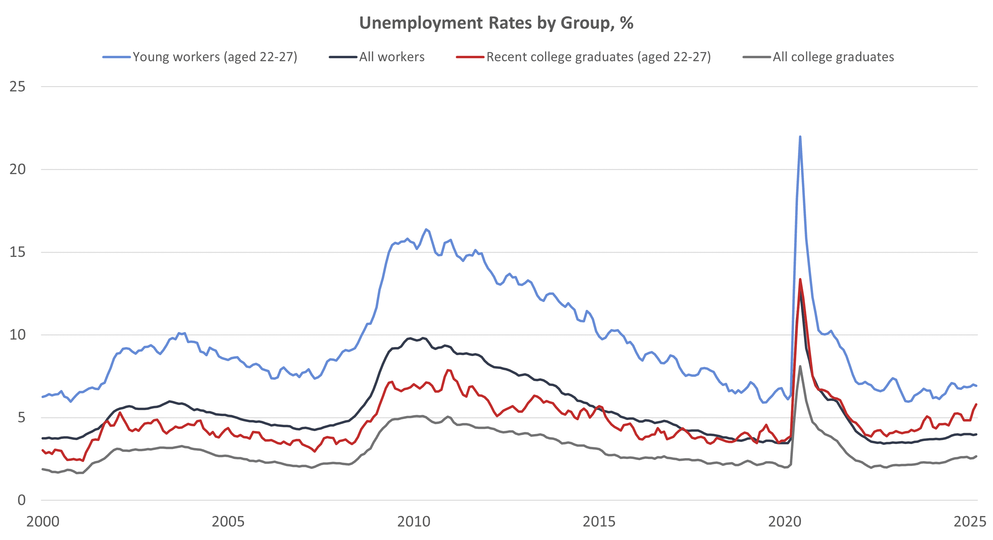 Data compiled by the Federal Reserve Bank of New York added to the dreary outlook for recent college graduates. The data in the graph below show that the unemployment rate for recent college graduates steadily climbed from 4.4 percent in January 2024 to 5.8 percent in March 2025, higher than the unemployment rate for all college graduates and the overall unemployment rate. The rate of change in the recent college grad unemployment rate has outpaced that of the other categories. Excluding the COVID-19 pandemic period, the unemployment rate for recent college graduates was the highest since October 2013.