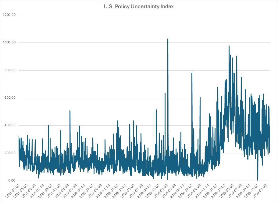 Source: Baker, Scott R., Bloom, Nick and Davis, Steven J., Economic Policy Uncertainty Index for United States [USEPUINDXD], retrieved from FRED, Federal Reserve Bank of St. Louis; Economic Policy Uncertainty Index for United States (USEPUINDXD) | FRED | St. Louis Fed, February 2, 2026.