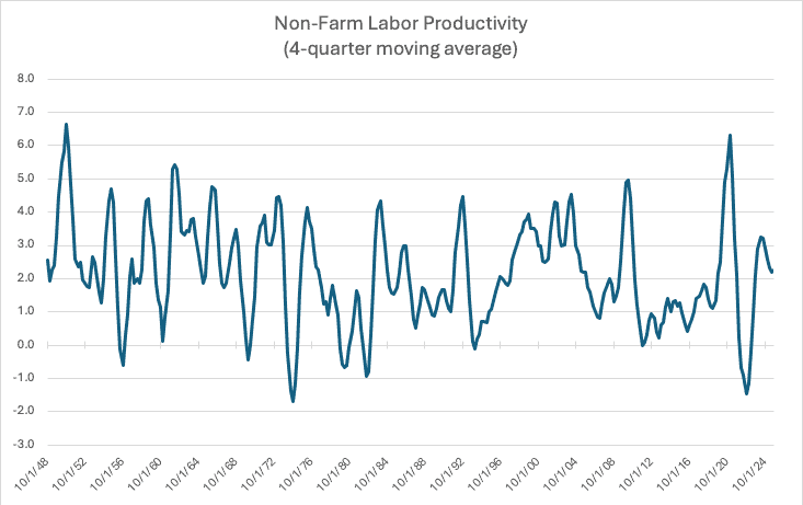 There is one last nuance worth highlighting. One can think of labor productivity going up because the laborer was given a measurable addition to his or her tools – a shovel, backhoe, calculator, computer, etc. Giving workers more or better capital to work with is known as capital deepening. Alternatively, there may be improvements – think a better business model (big box retail or artificial intelligence) that makes everything more productive. This is known as – economists are not legendary for the creativity – total factor productivity (TFP).