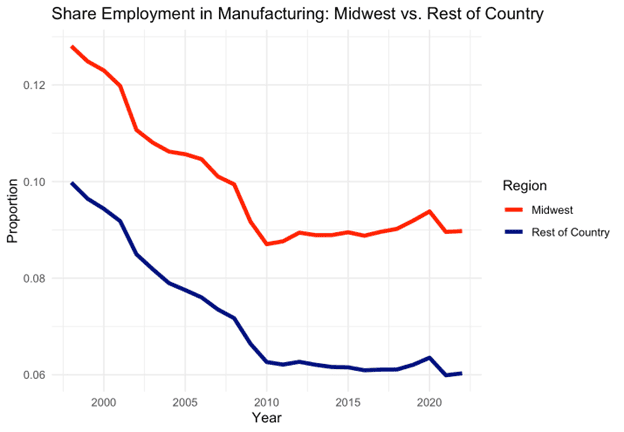 Has the Midwest de-industrialized? To get a feel for the issue, consider the graph below. It shows the fraction of gross state product (GSP) originating in manufacturing in the Midwest states versus the remainder of the country. (The Midwest Census region consists of Illinois, Indiana, Michigan, Ohio, Wisconsin, Iowa, Kansas, Minnesota, Missouri, Nebraska, North Dakota, and South Dakota.)