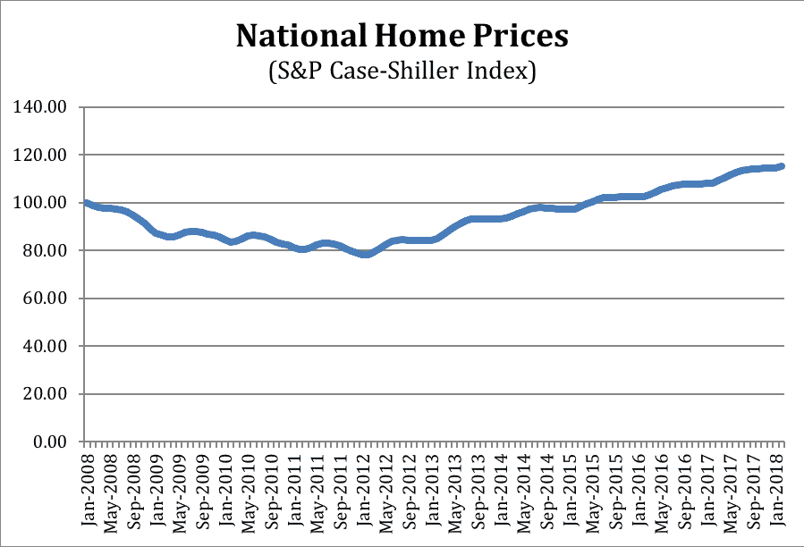 This is bad news, but it wouldn’t be as troubling if housing markets were remaining sensibly priced. But concern is rising on this front as well. The chart below shows the S&P CoreLogic Case-Shiller (“Case-Shiller”) index of home prices for 20 leading cities.