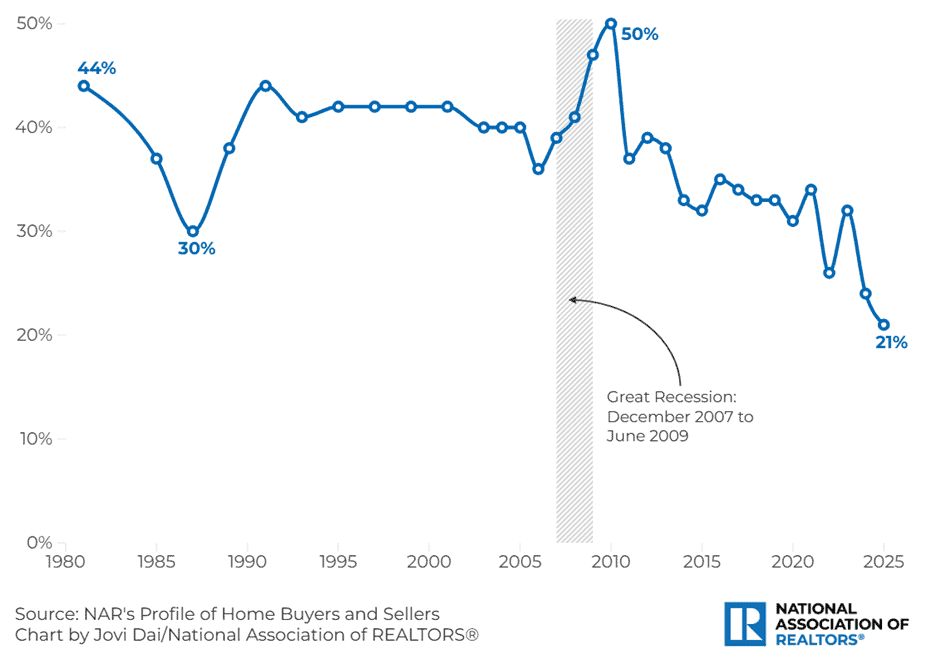 Affordability challenges are particularly dire for first-time home buyers. NAR data show that the first-time home buyer affordability index was 66.9 in Q3 2025 compared to the overall index of 101.0. In addition, NAR’s annual survey of home buyers and sellers who completed a transaction between July 2024 and June 2025 found that first-time home buyers made up just 21 percent of all buyers – an all-time low (Figure 2). Historically, first-time home buyers represented about 40 percent of home sales.