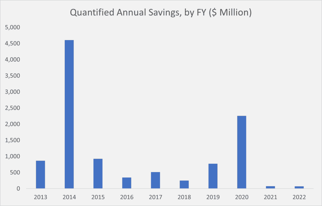 The high-water mark for Advocacy came in FY 2014 with roughly $4.8 billion in small business savings for both categories, mostly attributed to the agency’s involvement in a lawsuit that resulted in the repeal of an Environmental Protection Agency rule on “Effluent Limitation Guidelines (ELGs) for the construction and development industry.” FY 2022’s $73.5 million in quantified savings, however, is easily the lowest across this 10-year period. The runner-up year for lowest savings would be FY 2018 with roughly $250 million in either initial or annual savings. To put this past year’s total into even starker perspective, this $73.5 million total is merely 4 percent of the average initial cost savings (nearly $1.7 billion) and 7 percent of the average annual cost savings (roughly $1.1 billion) across this 10-year period.