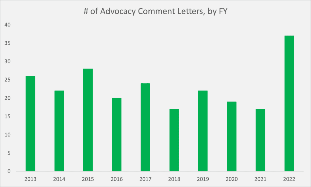 Why was FY 2022 so low? One might guess that there was simply not much in the way of regulatory activity for Advocacy to address. As the data in the following graph show, however, that could not be further from the truth.