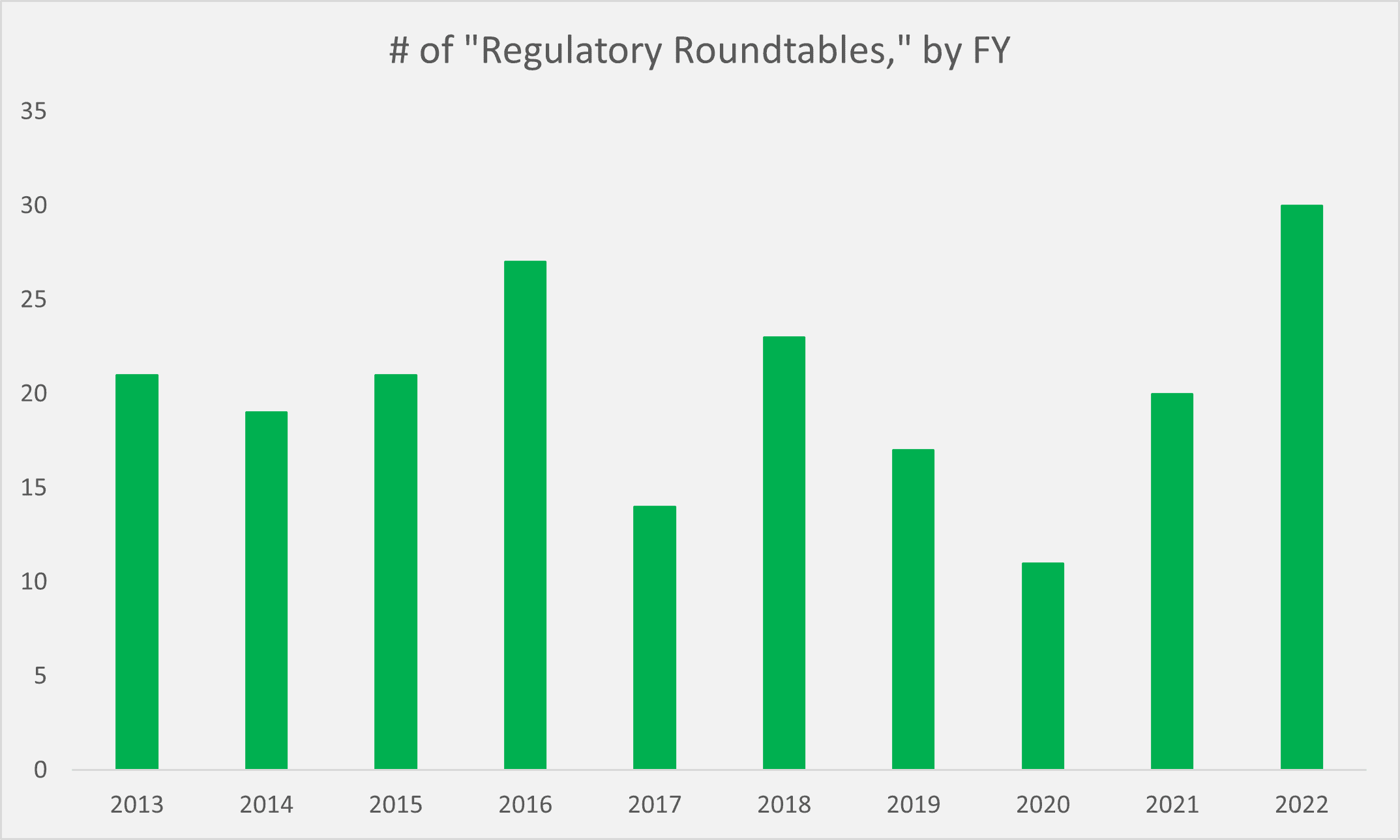 The Advocacy RFA Reports contain data on certain actions taken by the agency to further its mission “to monitor federal regulatory compliance with the Regulatory Flexibility Act.” These items include: 1) direct comment letters from Advocacy to the various agencies regarding aspects of a given rulemaking, 2) “regulatory roundtables” wherein Advocacy moderates a meeting between small business stakeholders and agencies, and 3) annual training of federal agency staff on how to comply with the RFA. As the following graphs illustrate, this FY 2022 dip was not for lack of trying on Advocacy’s part.