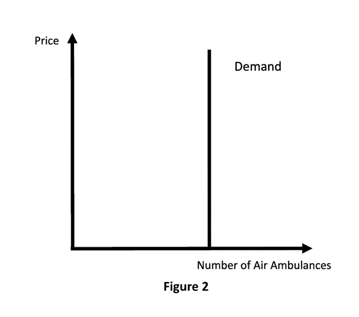 In an industry with normal market forces, prices and quantities of the goods supplied are dictated by the equilibrium between demand and supply. Therefore, the quantity demanded curve is negatively sloped as people buy less as the price increases (Figure 1). But in the air ambulance industry, the demand curve takes the shape of a vertical line (Figure 2). The quantity demanded stays the same, unaffected by price of the ambulance service