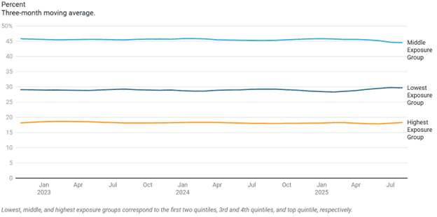 They then tried to determine if the share of workers in occupational exposure quintiles has changed since ChatGPT’s introduction. If AI were displacing jobs at scale, the authors indicate, there would be a smaller share of workers in some of the jobs that are most negatively impacted. Based on their analysis, the introduction of the new technology has not changed the quintiles in any pronounced way, as demonstrated in Figure 7, indicating that AI has not had a marked impact, if any, on displacing jobs.