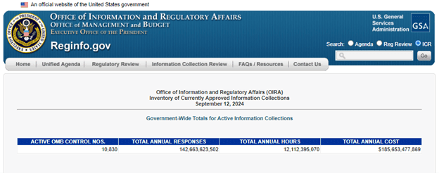 Despite the efforts included above, the federal paperwork load has continued to grow at an incredible rate. On July 10, 2023, – the release date of the 2023 Burden Reduction Report – the government-wide paperwork burden stood at 10.5 billion hours. As of September 12, 2024, that total was more than 12.1 billion hours – the highest level the American Action Forum (AAF) has recorded in more than 12 years of tracking this figure.[1]