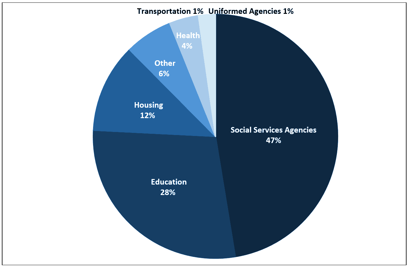 Of the $7.5 billion of federal funding, 47 percent ($3.5 billion) goes toward social services agencies, 28 percent ($2.1 billion) goes toward education, and 12 percent ($880 million) is devoted to housing. Another 4 percent ($289 million) goes toward health, 1 percent ($86 million) goes toward transportation, and 1 percent ($81 million) is devoted to uniformed agencies such as the New York City police and fire departments. The remaining 6 percent ($471 million) goes toward miscellaneous other matters.
