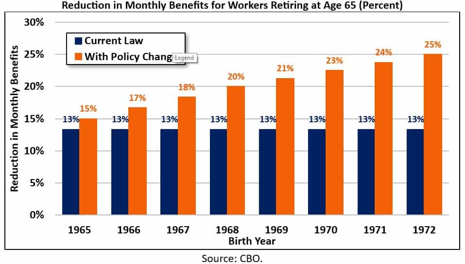 Workers born before 1965 would see no change in their Social Security benefits. Workers born in 1965 who claim benefits at age 65 (instead of their NRA of 67 years and three months) would receive monthly benefits that are 15 percent less than those they’d receive at their NRA. Workers born in 1972 who claim benefits at age 65 (instead of their NRA of 69) would receive monthly benefits that are 25 percent less than those they’d receive at their NRA.