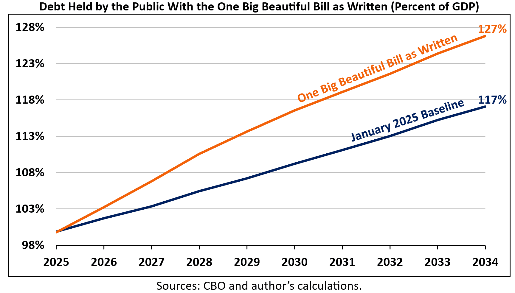 Higher budget deficits will cause the national debt to rise. CBO estimates the One Big Beautiful Bill will cause federal debt held by the public to grow from 100 percent of GDP ($30.1 trillion) at the end of FY 2025 to 127 percent of GDP ($53.7 trillion) by the end of FY 2034. In FY 2034, debt-to-GDP will be 10 percentage points higher than the 117-percent projection CBO made in January.