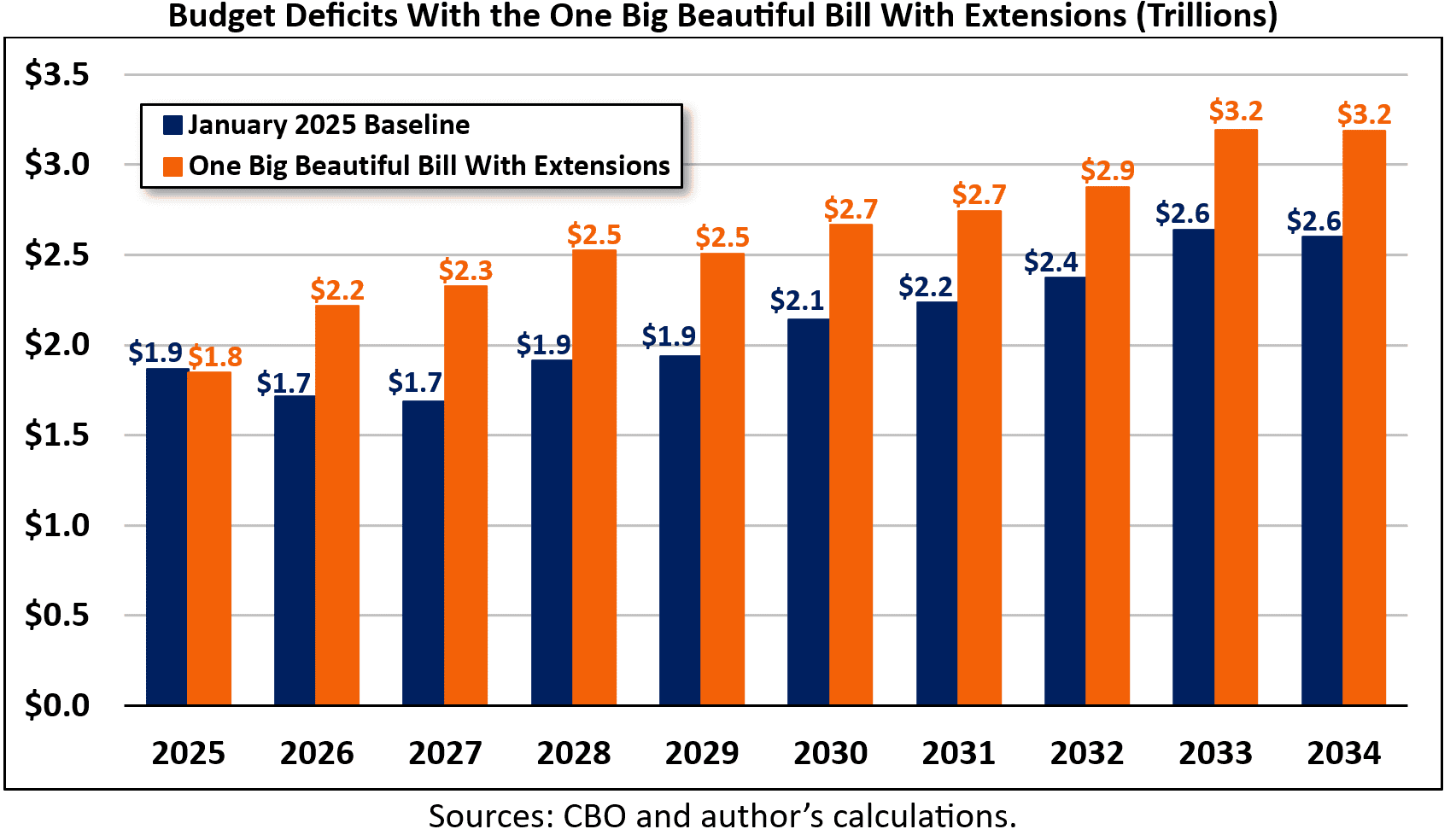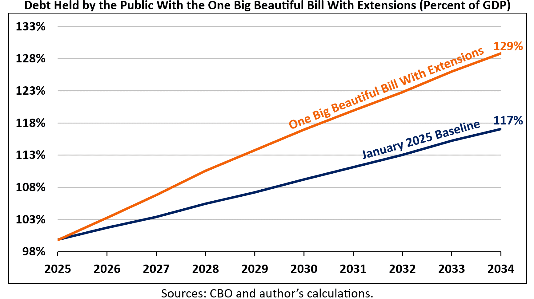 The higher budget deficits would cause the national debt to rise. CBO estimates the One Big Beautiful Bill with extensions would cause federal debt held by the public to grow from 100 percent of GDP ($30.1 trillion) at the end of FY 2025 to 129 percent of GDP ($54.5 trillion) by the end of FY 2034. In FY 2034, debt-to-GDP would be 12 percentage points higher than the 117-percent projection CBO made in January and 2 percentage points higher than the 127-percent projection with the One Big Beautiful Bill as written.