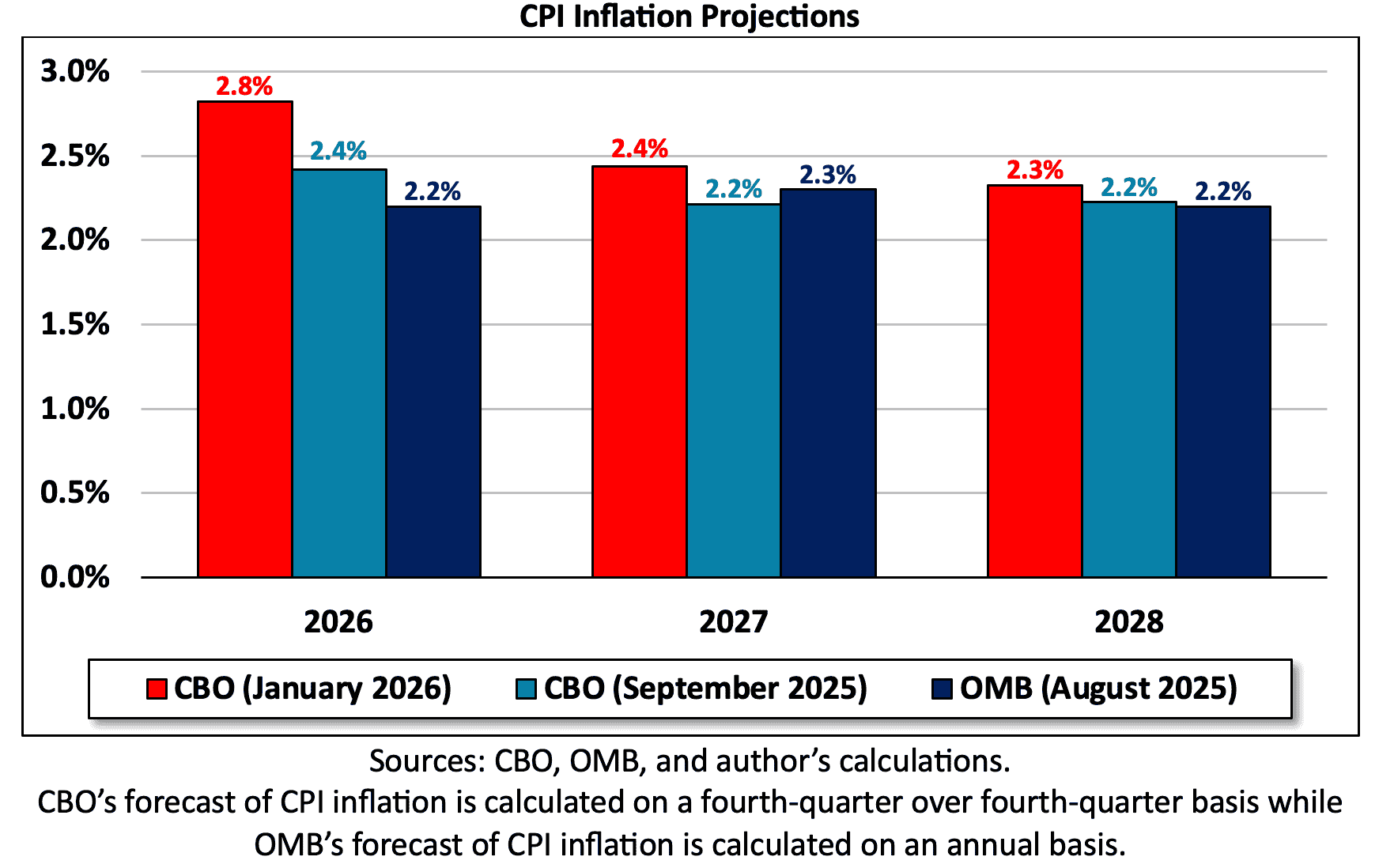 CBO expects Consumer Price Index (CPI) inflation, on a fourth-quarter over fourth-quarter basis, to fall from 3.0 percent in 2025 to 2.8 percent in 2026. CPI inflation will continue to soften to 2.4 percent in 2027 and to 2.3 percent in 2028. In September, CBO projected CPI inflation would fall from 3.1 percent in 2025 to 2.4 percent in 2026 and then stabilize at 2 percent by 2027. In both forecasts, CBO expected a softening of CPI inflation, though its latest CPI inflation projections are slightly more pessimistic than its September forecast. On an annual basis, OMB projects 2.2-percent CPI inflation in 2026, 2.3 percent in 2027, and 2.2 percent in 2028.